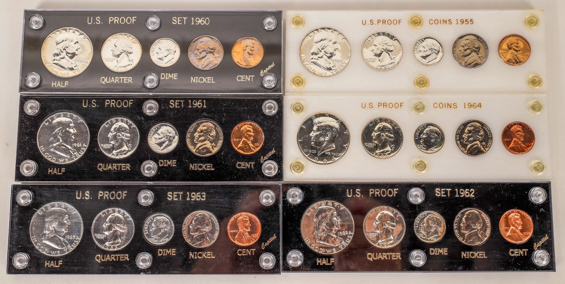 Lot of six U. S. proof sets in Capital plastic holders: 1955; 1960; 1961; 1962; 1963; 1964. Coins are blemish free.
