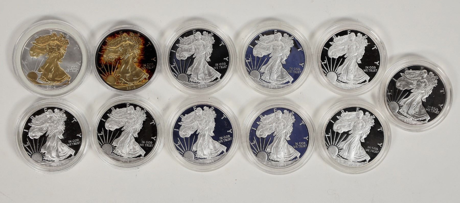 Eleven proof silver eagle .999 fine one ounce dollar coins: Nine in original U. S. Mint packaging: 2014 (2); 2015 (2); 2016 (2); 2017 (2); 2000. Two specially enhanced: 2014 gold plated; and 2014 "Burning Liberty" treated with black Ruthenium.
