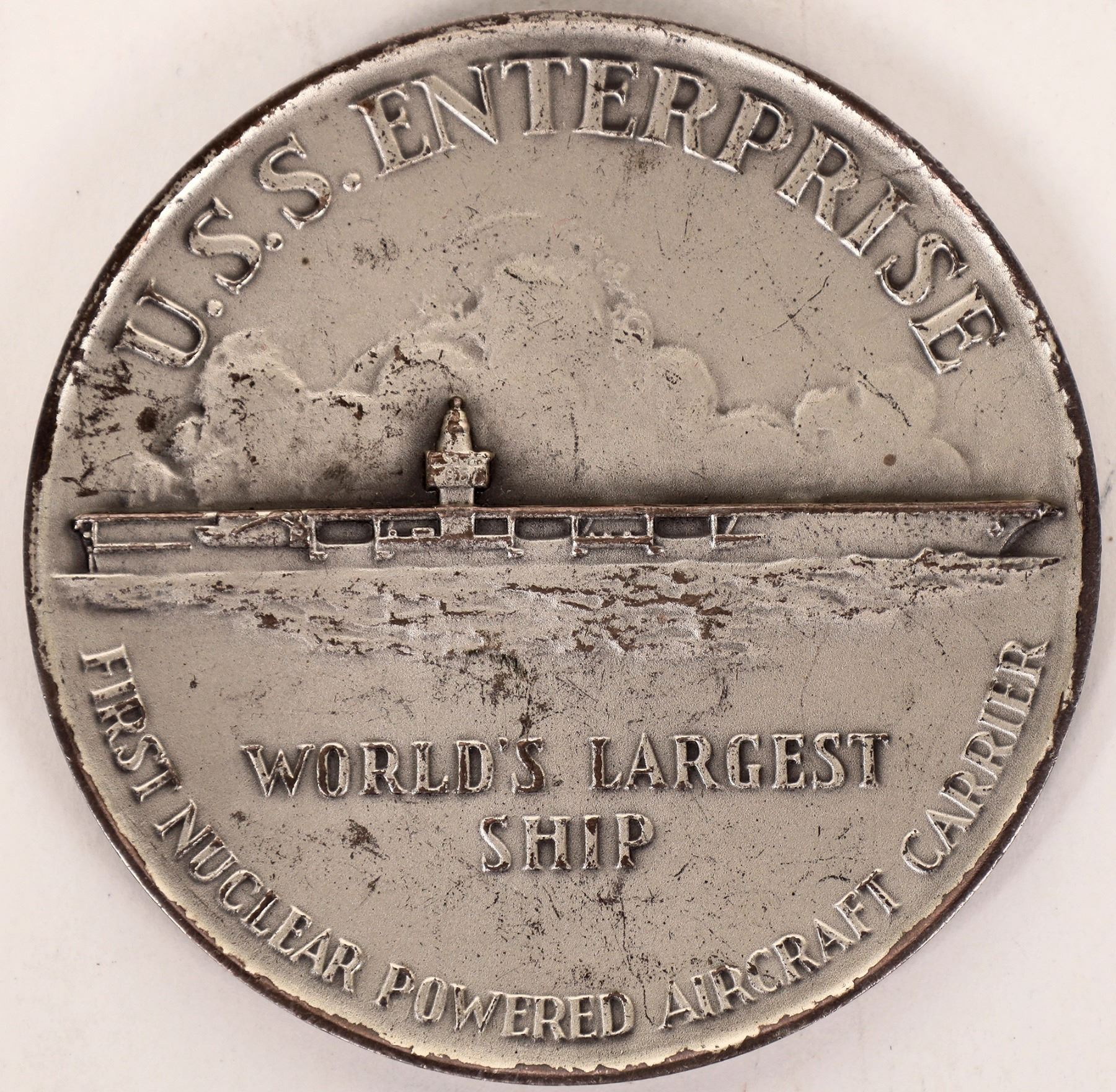 Made by the Medallic Art Co. of .999 fine silver, the official launching medal of the U. S. S. Enterprise, the world's first nuclear powered aircraft carrier. Built by Newport News Shipbuilding and Dry Dock Company, the ship launched September 24, 1960 at Newport News Virginia. The silver medal is 63mm and weighs 132.5 grams (4.7 ounces). Designed by Ralph J. Menconi.