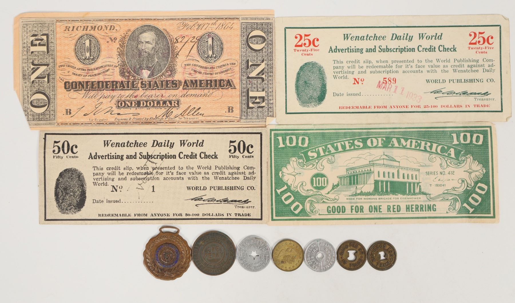 Four pieces of scrip: Wenatchee Daily World credit checks (2); Elect Philippi & Phillips to the Republican convention; Truman dollar: good for one red herring. Seven tokens: H. T. Portland Oregon; Washington tax token; YMCA Swimming; Masonic penny, Portage, Washington; Good For 5c In Trade (2).