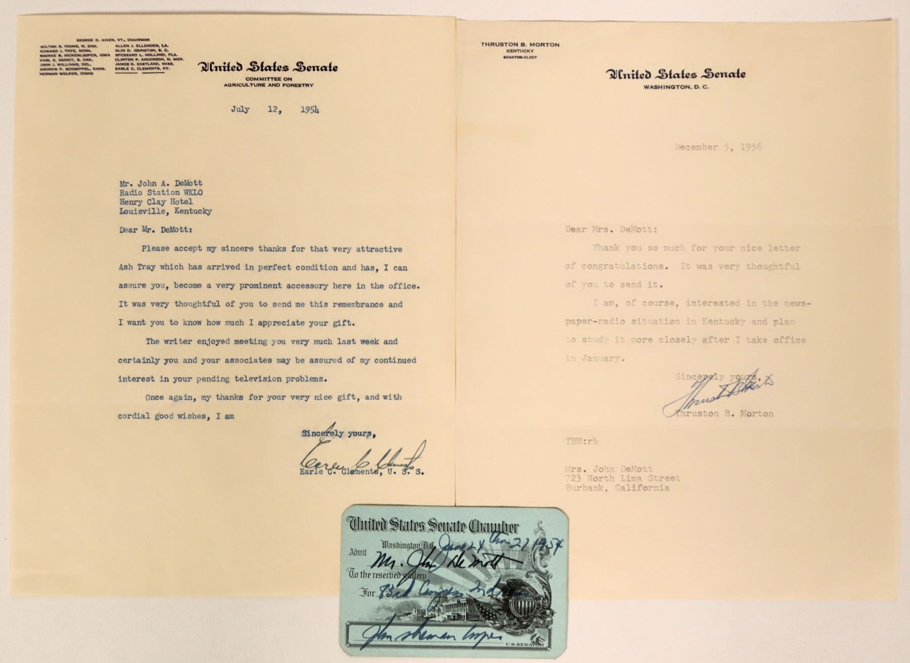 Lot of three related U.S. Senate items, c1954-56. Includes pass to U.S. Senate Chamber June 24-27, 1954, admitting John DeMott to the 83rd Congress, Second Session, signed by John Sherman Cooper, R-Kentucky. Also a July 12, 1954, letter to John A. DeMott, Radio Station WKLO, Louisville, KY, signed by Earle C. Clements, D-Kentucky, and subsequent correspondence letter dated Dec. 5, 1956, to Mrs. John DeMott, Burbank, CA, signed by Kentucky Senator-Elect Thruston B. Norton. Fine condition.