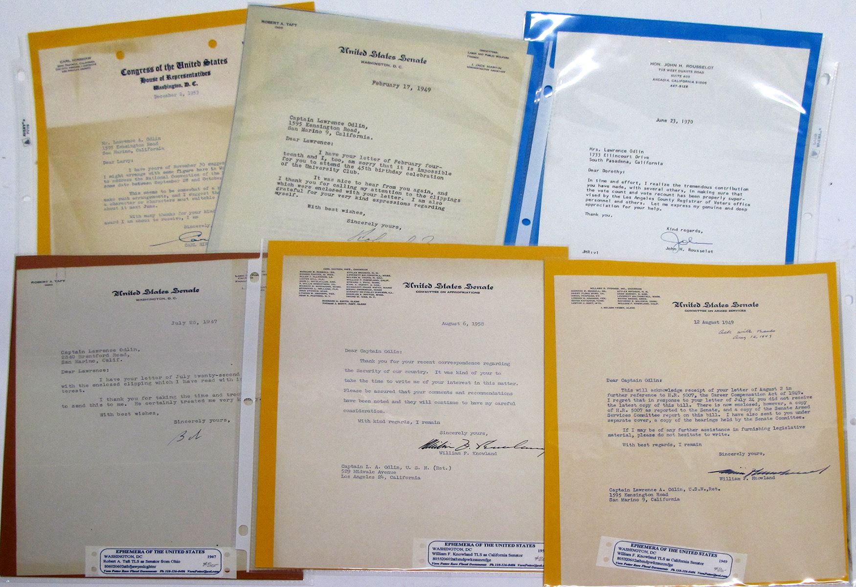 Lot of 11 on official letterhead. All are signed. 1) US Senator Robert Taft (Ohio). Five letters (1940, 1947 (x2), 1949 (x2). 2) US Senator William F. Knowland (California). Three letters (1949 (x2) and 1958). 3) Bruce V. Reagan, running for California State Controller. 1962. 4) John H. Rousselot as LA County Registrar of Voters, 1970. Date: 1940-1970 Location: HWAC# 66070