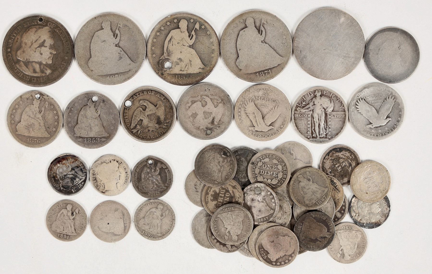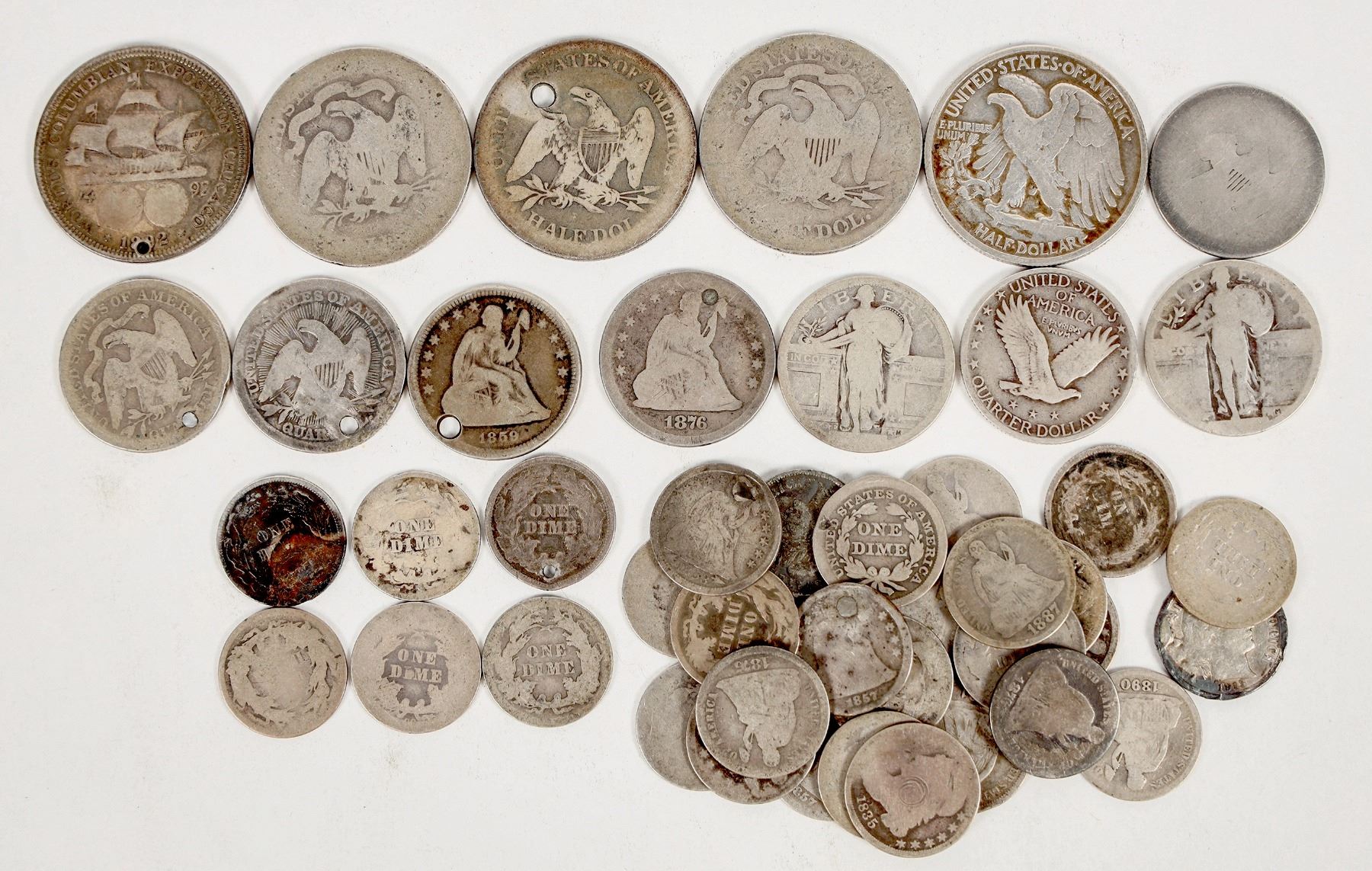 Forty seven coins that were well used in their time: five half dollars: three seated liberty, one walking liberty with no obverse; a holed Columbus Exposition. Eight quarters: five seated liberty, two holed; three standing liberty, all dateless. Thirty four dimes: two love tokens made from seated liberties; 1835 Capped Bust; 25 seated liberty dimes, two holed; six Barber dimes. Over $200 silver content when they were new coins.