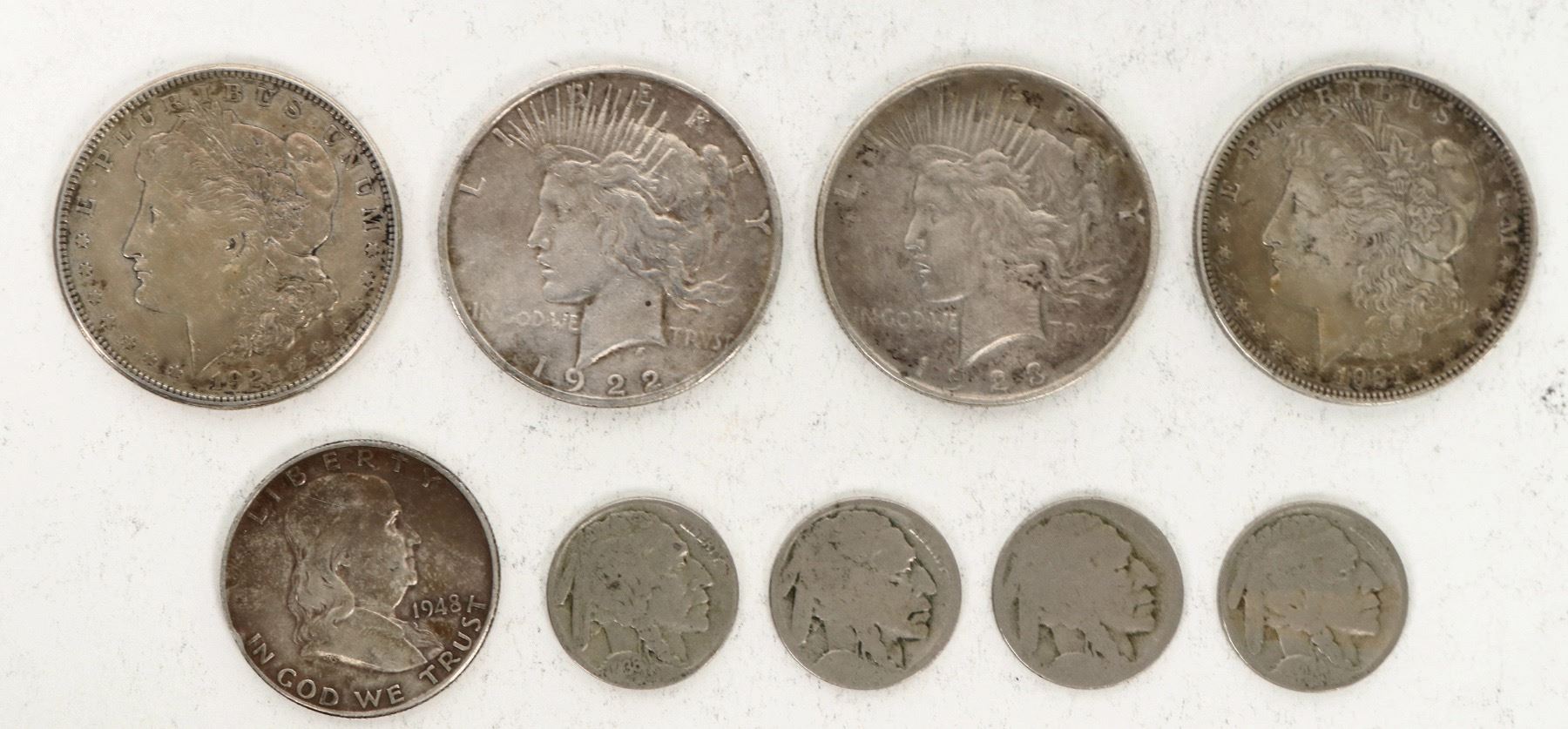 Miscellaneous lot of nine U. S. coins: four Buffalo nickels; 1948-D Franklin half dollar (VG-F); four silver dollars: 1921 Morgan; 1921-S Morgan; 1922-S Peace; 1923-D Peace. Dollars are F-EF condition.