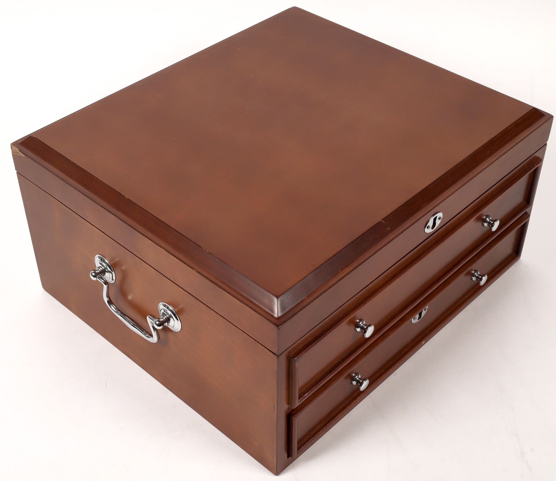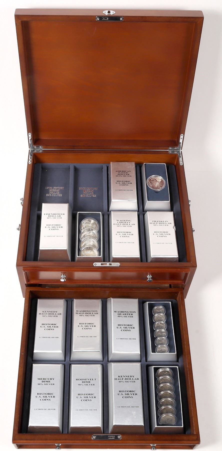 Issued by PCS Stamps and Coins, a wooden case (15 x 14 x 8 inches). Room for eight ingot sized boxes with total silver content on the top. Ten of the sixteen slots have coins: American Eagle Silver Dollar; Eisenhower Dollar 40% Silver (4); Walking Liberty Half-Dollar (3); Franklin Half Dollar (3); Kennedy Half Dollar 90% (3); Washington Half-Dollar 90% (3); Washington Quarter (6); Mercury Dime (14); Roosevelt Dimes (13); Kennedy Half Dollars 40% (7). Total silver 10.7 ounces. Six empty spots to complete the collection. Coins range from G-BU condition.