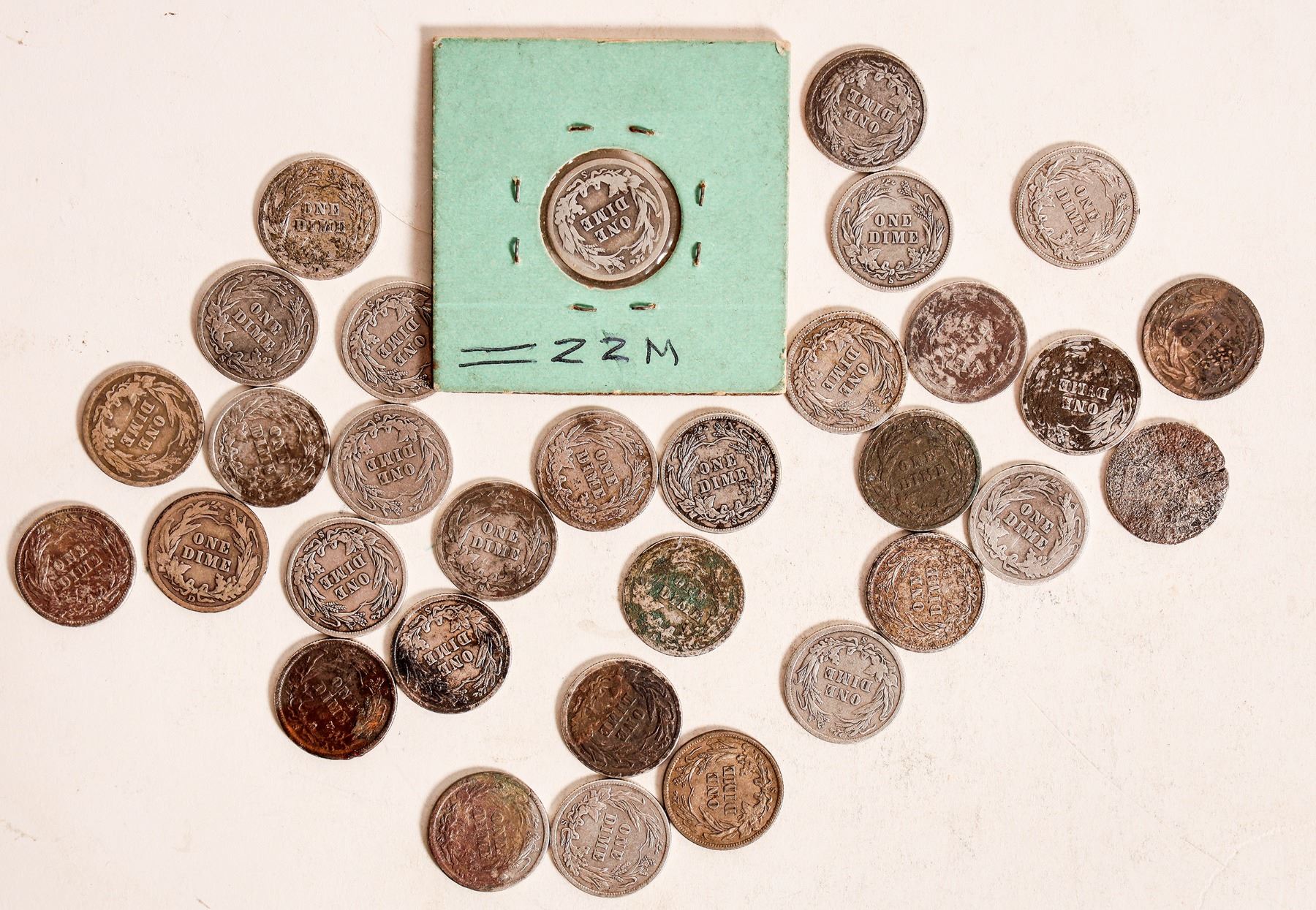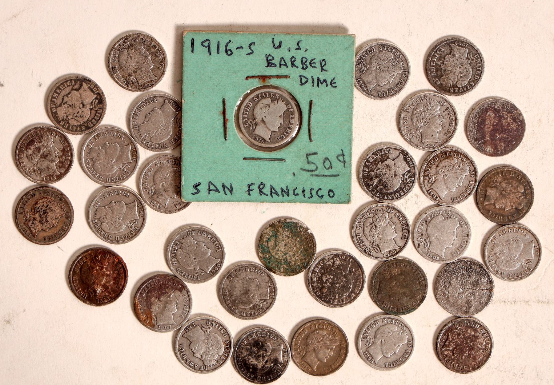 Lot of 34 90% silver U.S. dimes, many metal detector finds: 1831 Capped Bust, P-FR; 1888 Seated Liberty, FR-AG; 32 Barber dimes: some corroded, some as good as VG-F condition. Many "S" mintmarks.