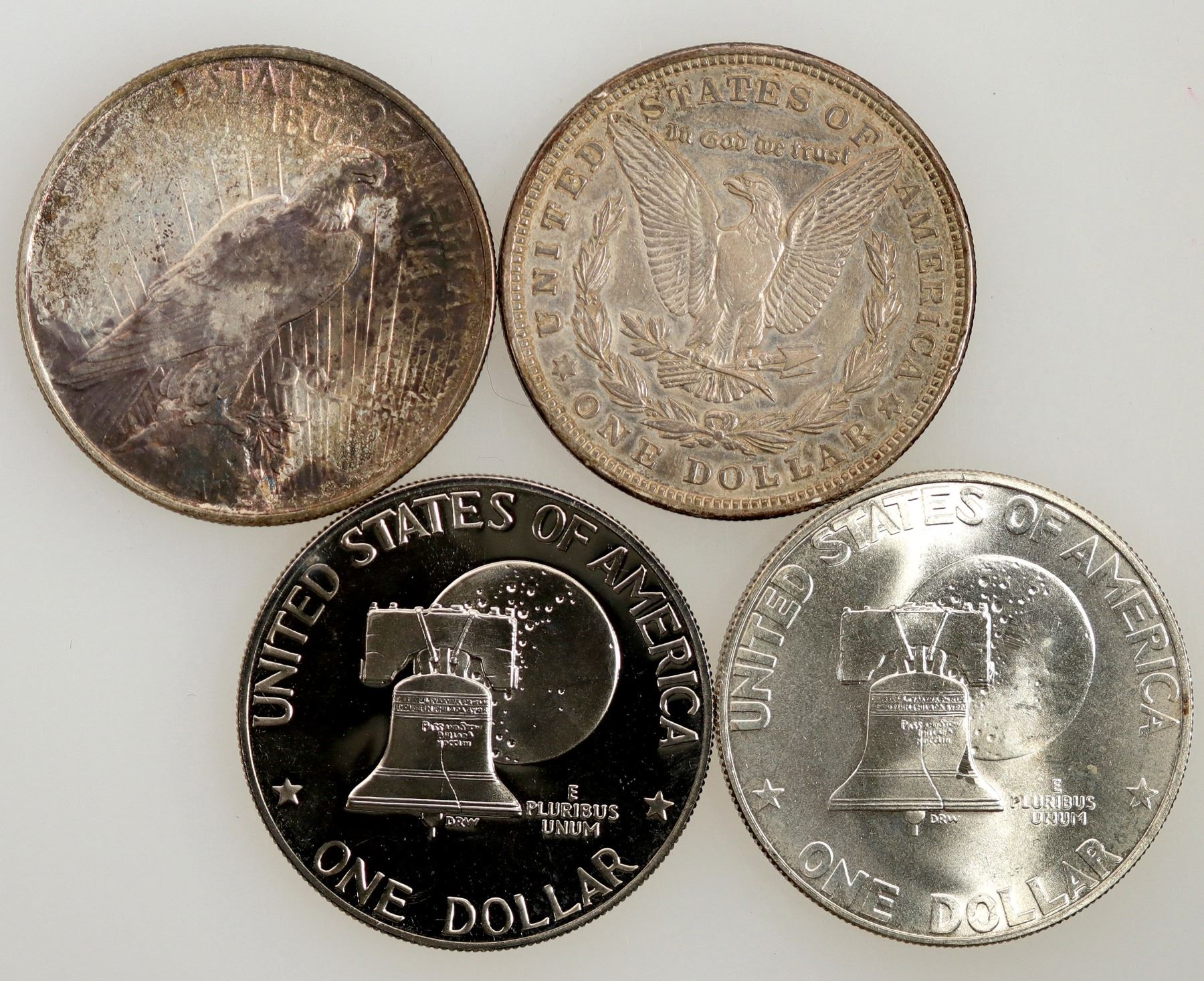 Lot of four U. S. Silver dollars: 1921 Morgan, VF-EF; 1922 Peace, AU, toned; two 1776-1976 Bicentennial Eisenhower dollars, one BU, one frosted proof.