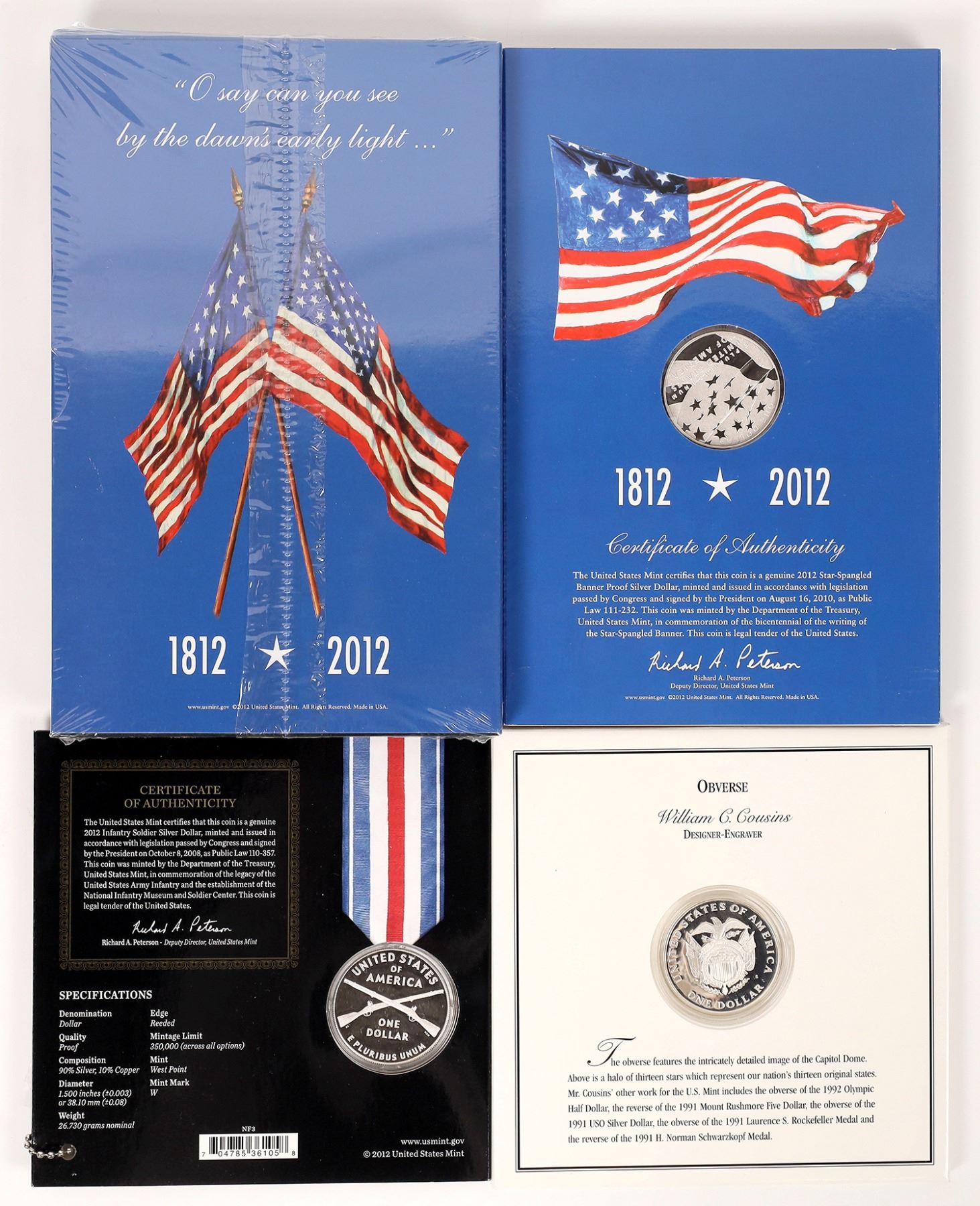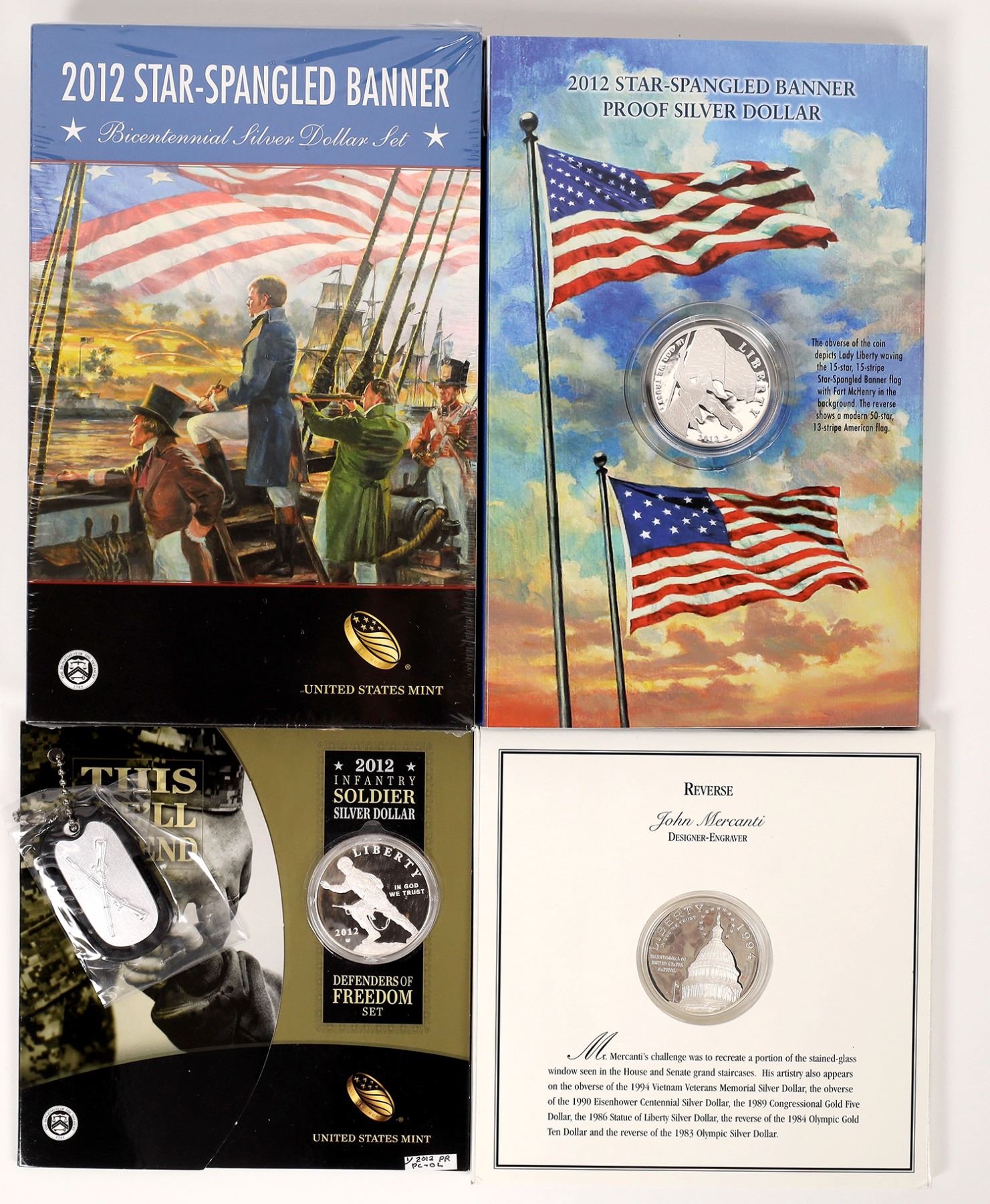 Lot of four modern U. S. mint silver dollars in mint packaging: The U. S. Capitol 1994; 2012 Infantry Soldier; two 2012 Star-Spangled Banner Bicentennial silver dollar sets.