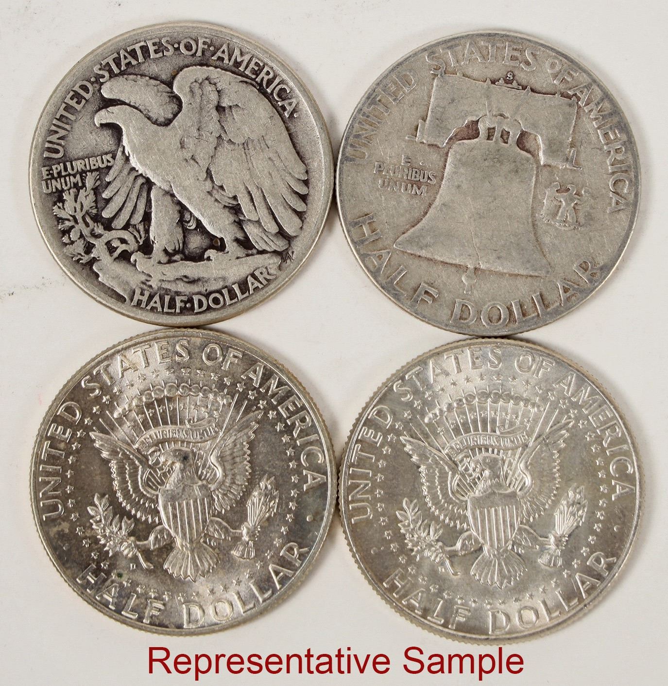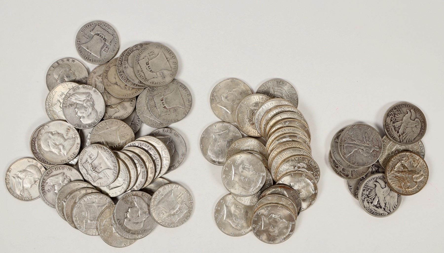 Circulated United States Silver dollars: Walking Liberty (9); Franklin (26); 1964 Kennedy (23); Kennedy 40% (3). Some AU-BU, the Walking Liberties are VG-EF.