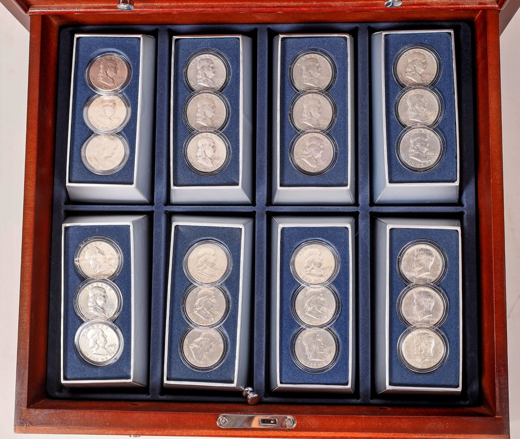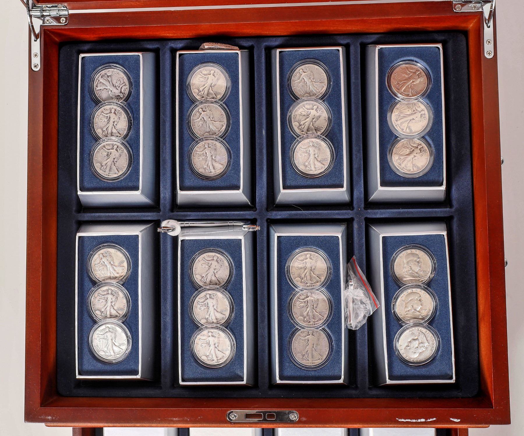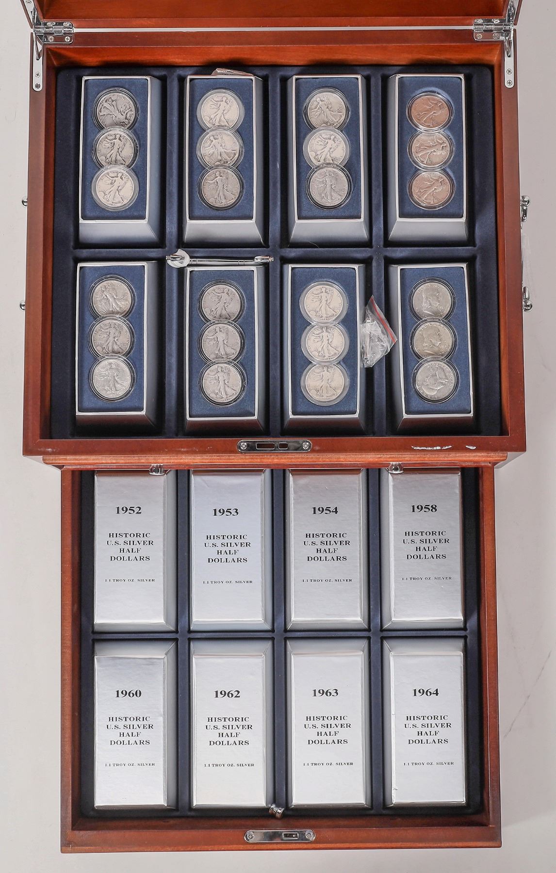 Locking wooden box (15 x 13 x 7 inches) with 48 silver U. S. Half dollars in cardboard boxes shaped like ingots. Three coins to box, 16 boxes. The years of 1939; 1940; 1941; 1942; 1943; 1944; 1945; 1951; 1952; 1953; 1954; 1958; 1960; 1962; 1963 & 1964. Walking Liberties range from G-VF; Franklins from VF-BU; Kennedys AU-BU. 17.6 ounces of silver. Issued by PCS Stamp & Coin.