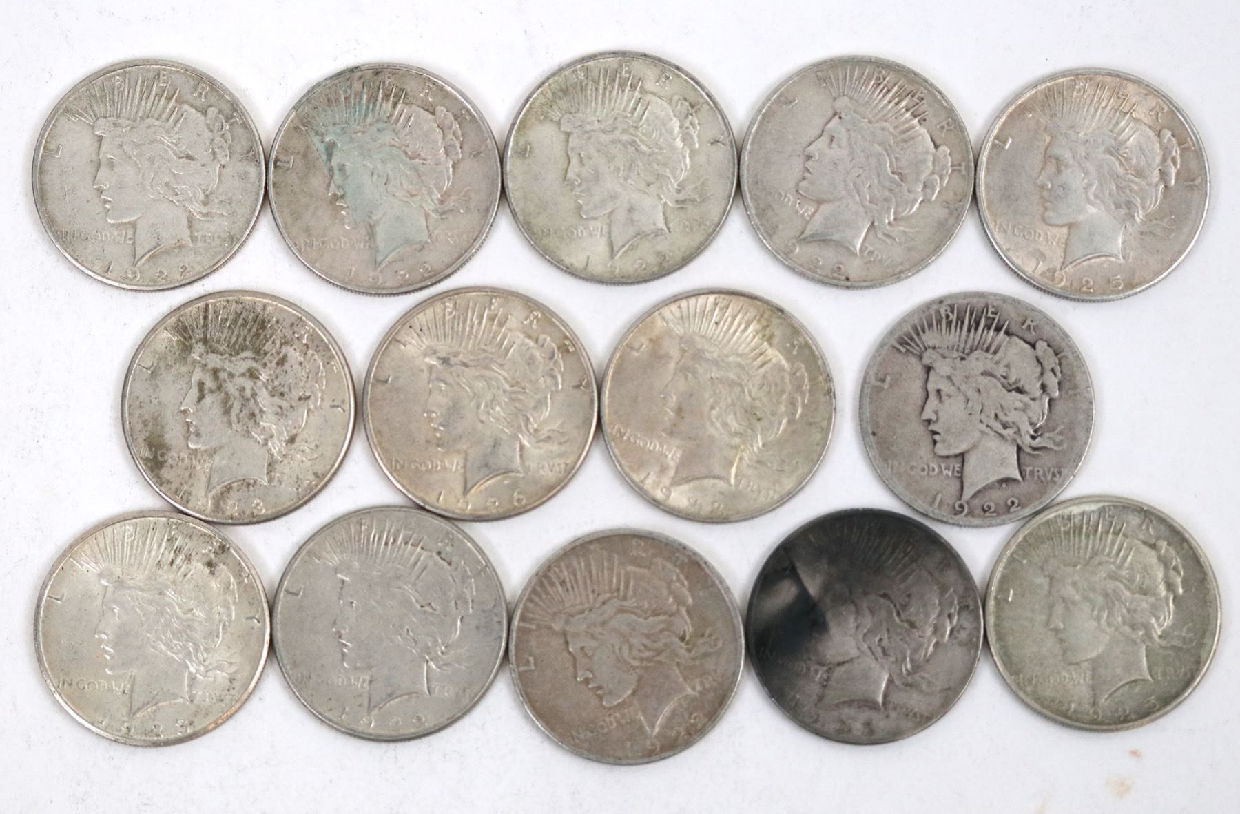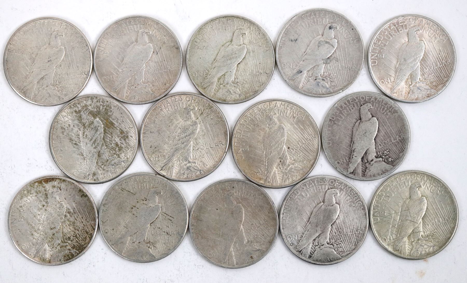 Lot of fourteen average circulated Peace dollars. Includes a 1935-S, but G-VG condition and toned.[