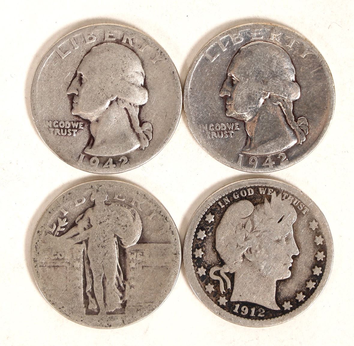 Lot of 70 silver (90%) U. S. quarters: Barber (1912); Standing Liberty (5 dateless); Washington (64) AG-AU condition. [