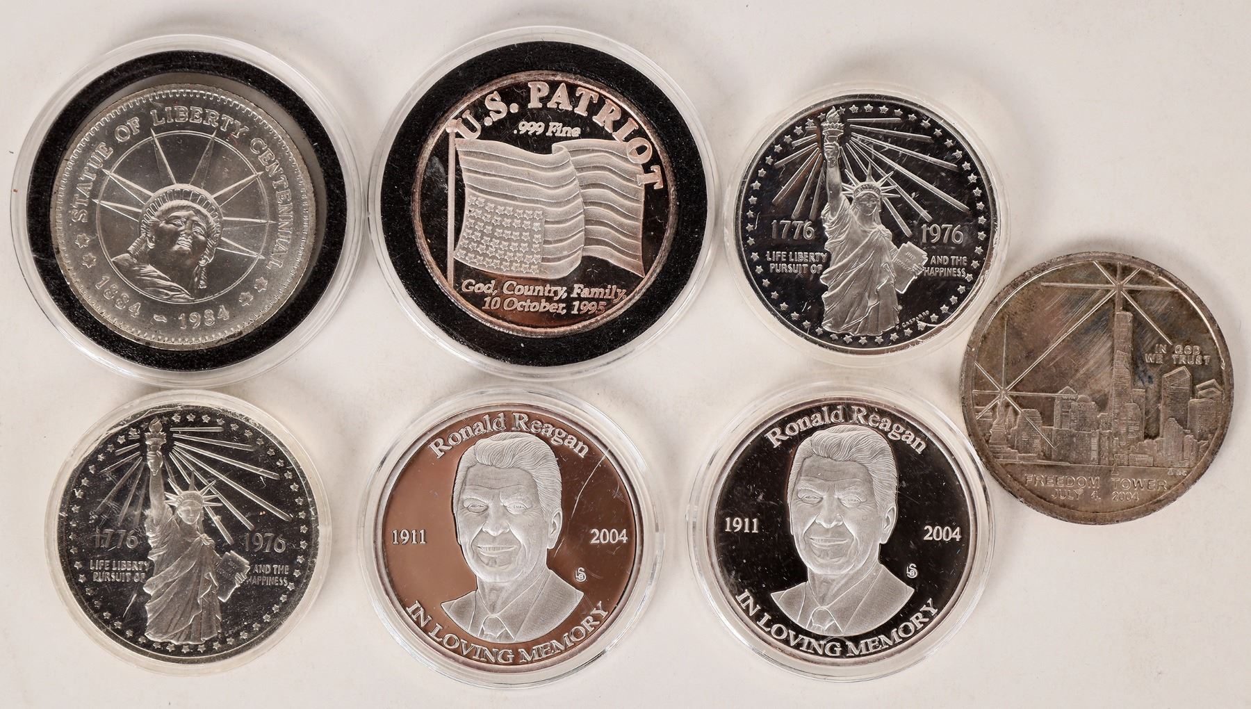Lot of seven silver rounds but only one is marked .999 fine: U. S. Patriot. The other medals may or may not be silver: Two Ronald Reagan 2004 memorial medals; three Statue of Liberty medals; and one 2004 Freedom Tower 9/11.
