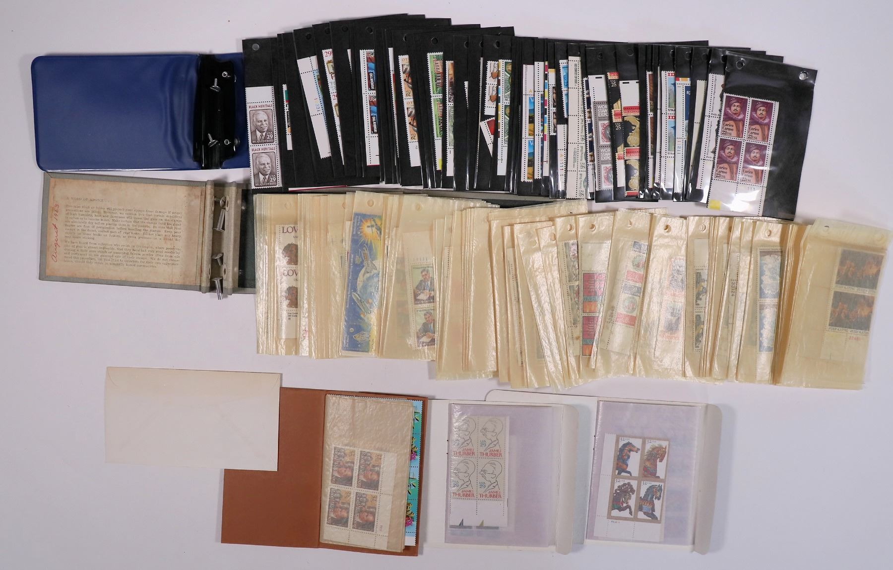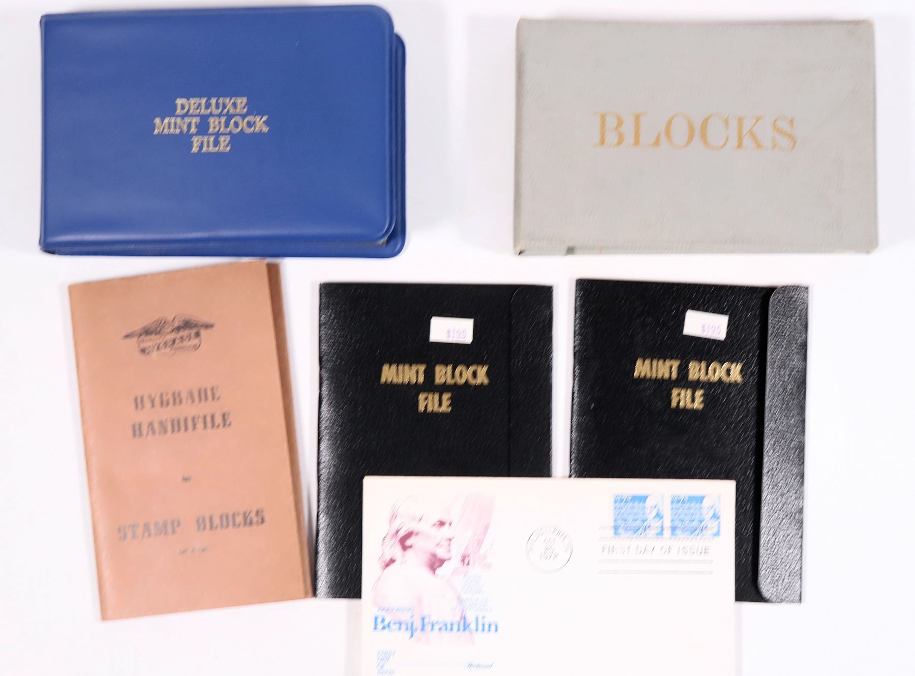 Lot of five mint plate block books with U. S. Stamps, also a 1972 Ben Franklin first day cover. The grey book has Bicentennial stamps on the front page, and 6-20 cent plate blocks inside. the two black books have 29-32 cent stamps; the brown Hygrade Handifile has 29-40 cent plate blocks. And the large blue binder starts with 22 cent Enrico Caruso and ends with 29 cent Chinese New Year.