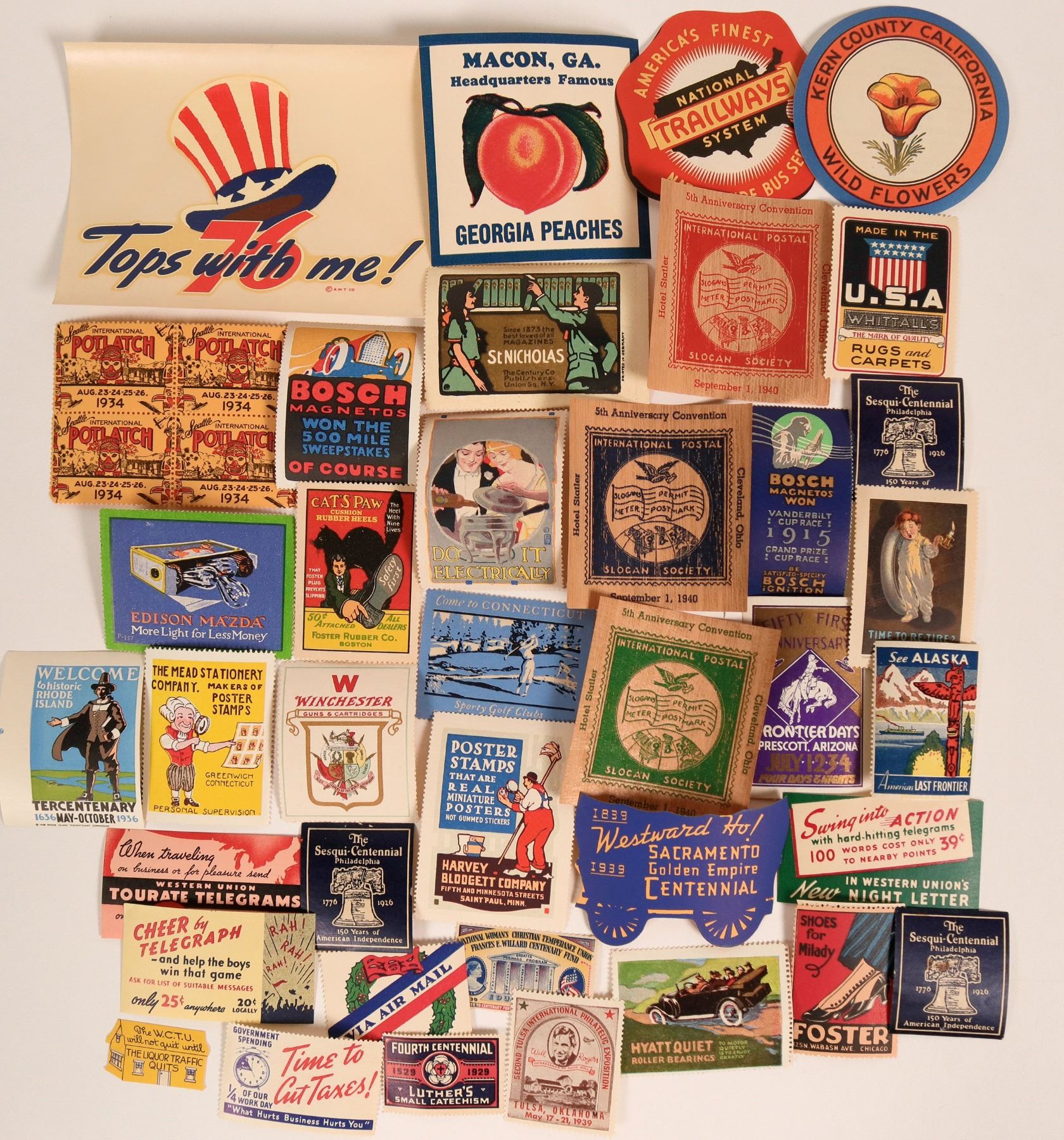 Sever stickers for celebrations, various locations 1930-40s, not used, many are travel stickers, miniature advertisements for tourism, different products