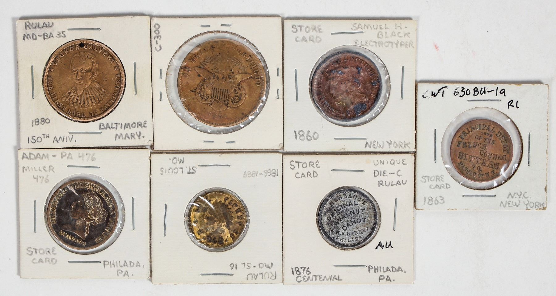 Lot of seven store cards and medals: 1) Sleeper Umbrellas Philadelphia; 2) Principal Depot of the French Cognac Bitters, New York; 3) Packet Co., St. Louis; 4) Samuel H. Black Electrotyper, New York; 5) Harbach's Original Walnut Candy, Philadelphia; 6) 1856 City Hall New York; 7) 1880 150th anniversary of Baltimore, holed.
