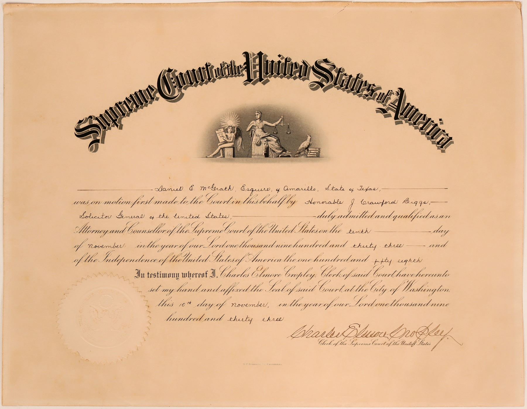 Original, signed certificate appointing Daniel E. McGrath, Esquire of Amarillo, State of Texas on motion made by the Honorable J. Crawford Biggs, Solictor General of the United States , as an Attorney and Counselor of the Supreme Court of the United States on the 10th day of November in the year 1933 and of the Independence of the of the United States of America the one hundred and fifty eighth. Testified by Charles Elmore, Cropley, Clerk of said Court. Signed by same and embossed with hand affixed seal of the Supreme Court at the City of Washington. Names and dates handwritten in ink. Parchment paper certificate measures approximately 19" x 15". Worn and discolored along top edge with one small tear, some discoloration from age. See high resolution photograph for condition.