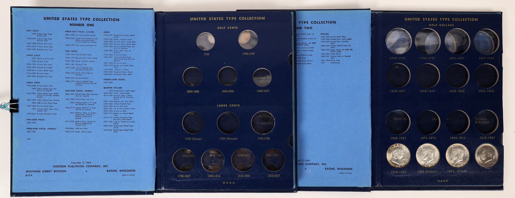 Two blue Whitman coin albums 9434 & 9435. Large type coins contains five coins: a Franklin half; silver Kennedy half, clad Kennedy half, cupro-nickel Kennedy half, and 1971 Ike dollar. Small type coins contains: 19 coins: two Indian head pennies, four Lincoln cents; two cent piece; seven nickels, three dimes, two quarters.