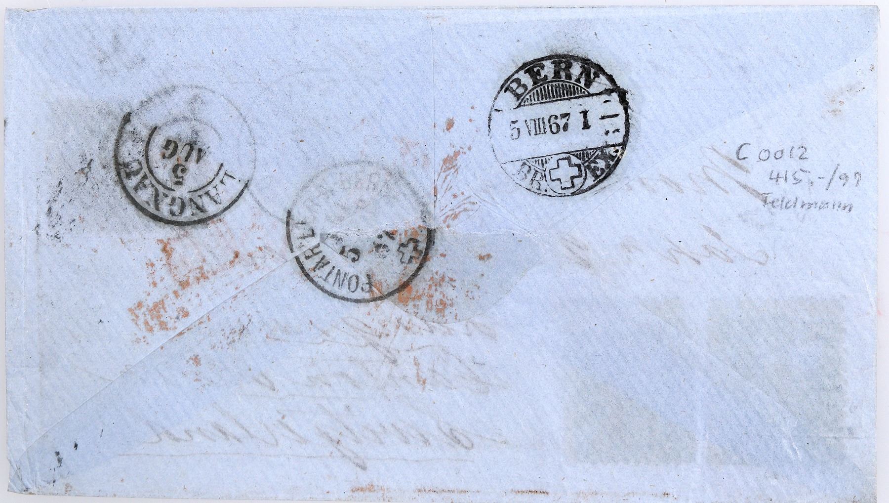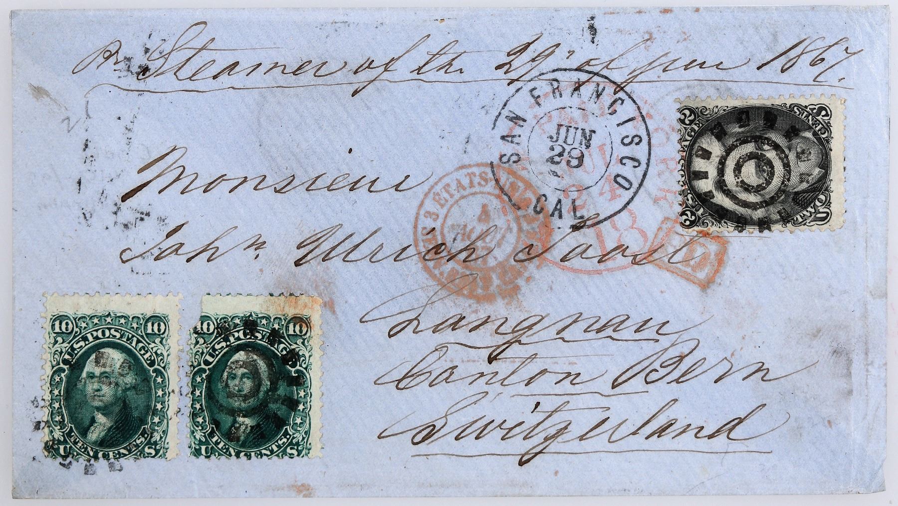 US 73 black 2 cents and 2x 98 green 10 cents tied by San Francisco cog cancels on cover to Switzerland. Jun 29(1867) SF CDS, Aug 4 67 France received. Docketed per steamer of the 29 of Jun 1867. Jul 24 paid 18 New York recd cds. Pencil writing on back.