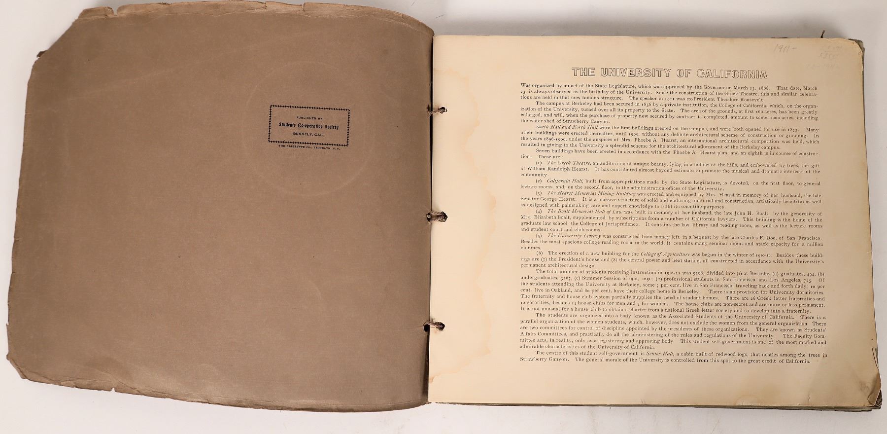 1911 UC Berkeley photo album with 21 5.75x7.75" campus photos and Greek Theatre panorama. Some left side water stains, but not on photos. California Berkeley