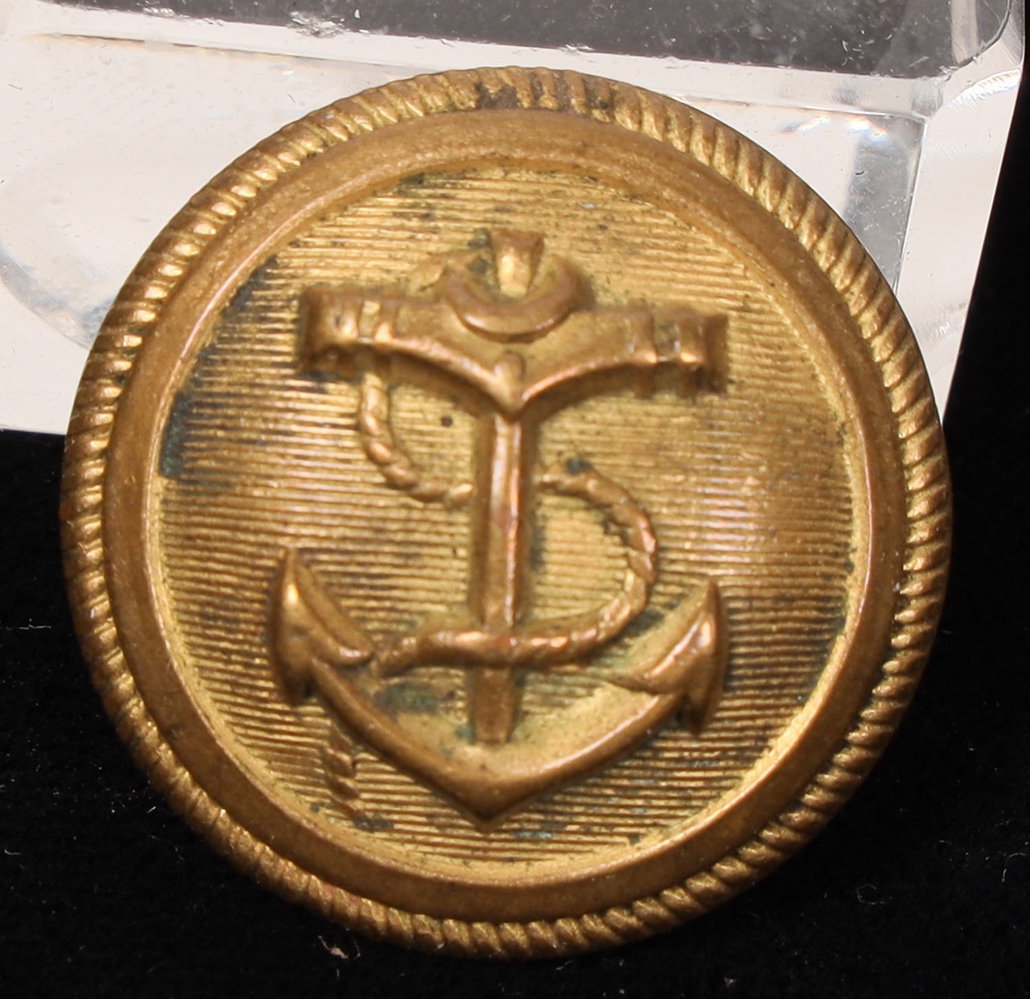This early naval button is 15/16 in. across, domed with an anchor and horizontal line background. The reverse is Waterbury Button Co. with a fixed copper shank. Pleae see photos for details.