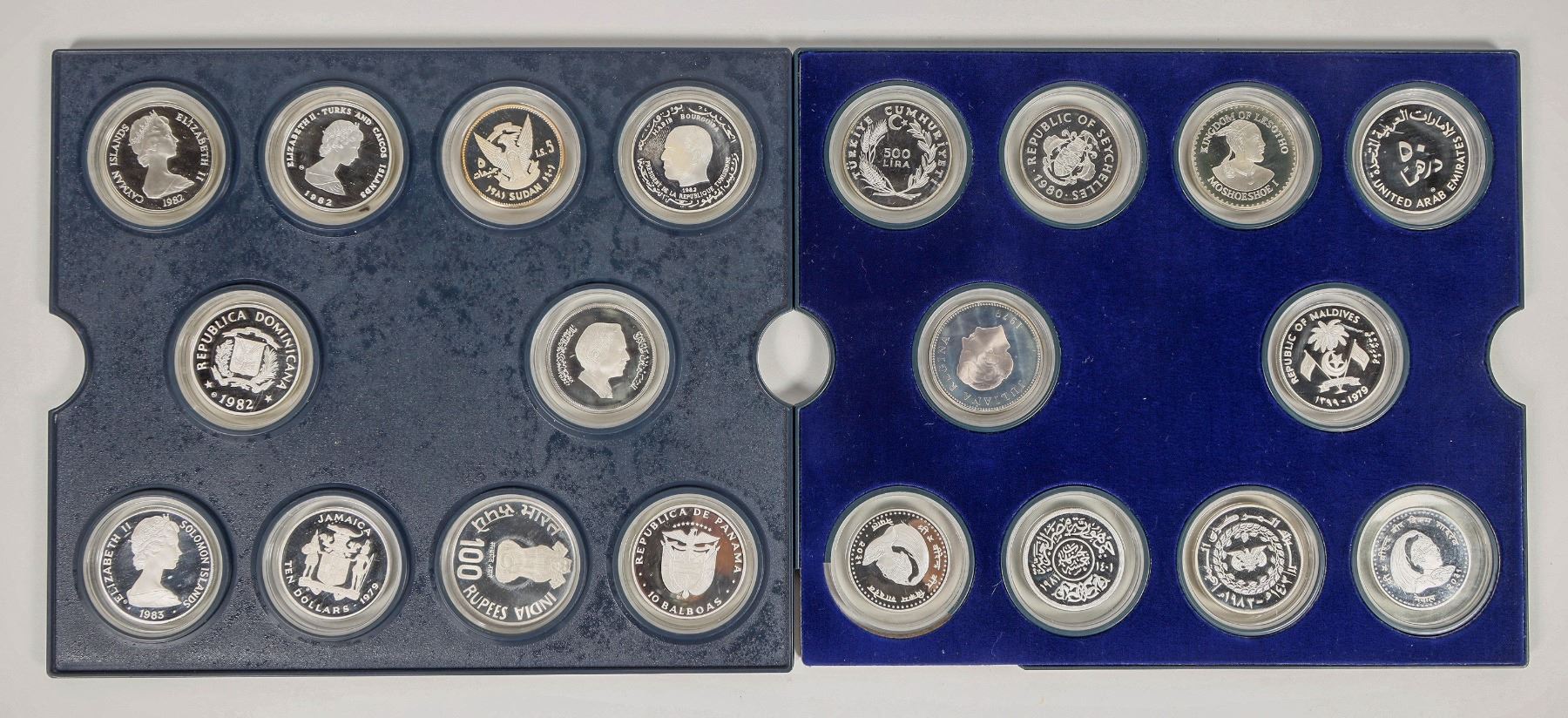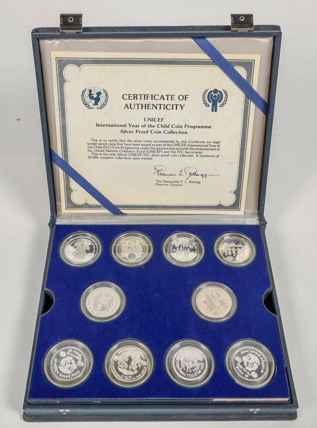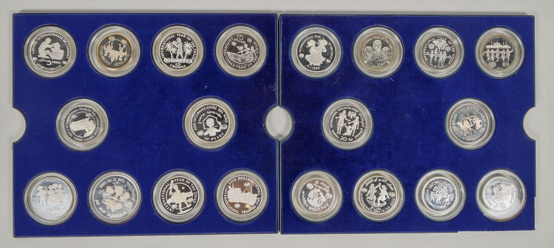 UNICEF International Year of the Child Coin Programme Silver Proof Coin Collection. In original blue case with Certificate of Authenticity, and twenty coins in hard plastic cases. (the set consisted of 30 coins, there is room to complete the set. Sixteen are dollar sized coins; four are half dollar size.