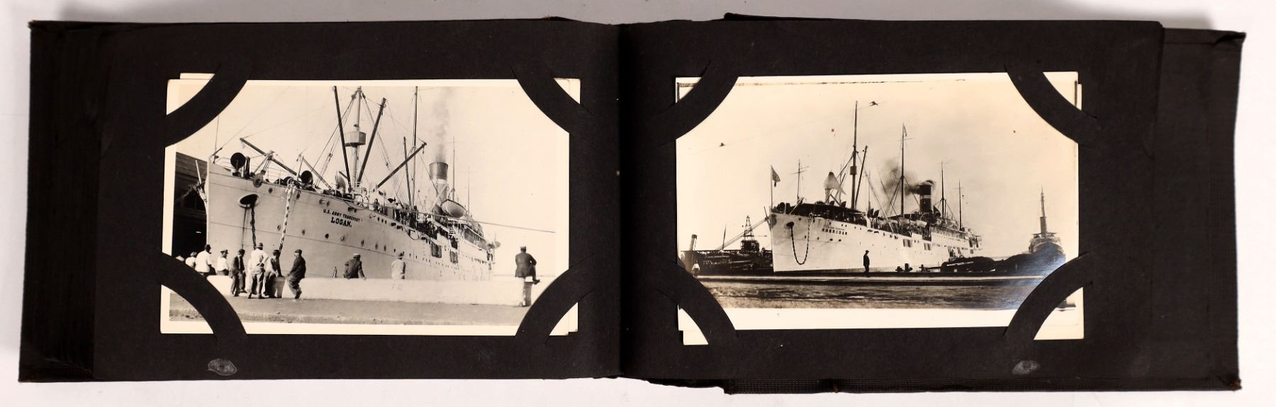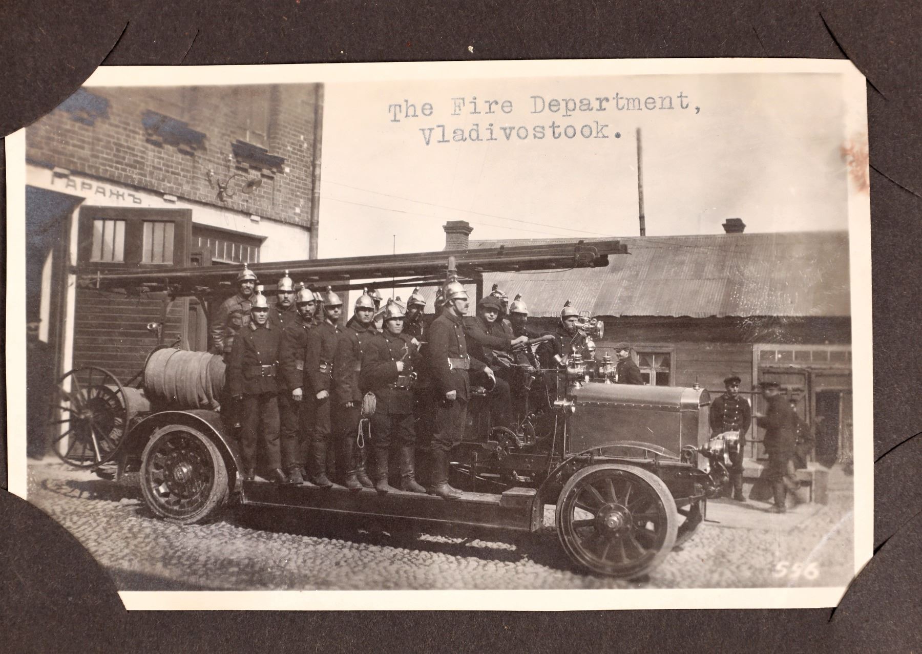c. 1919 US Soldiers album consisting of 100+ RPC's and original photos, about 3.5x5.25". Some have typed descriptions such as Vladivostock. Other identified as Nagasaki, Manila, Olongapo. Ships of various sorts. Fire department looking somewhat like a scene from the film Fahrenheit 451!