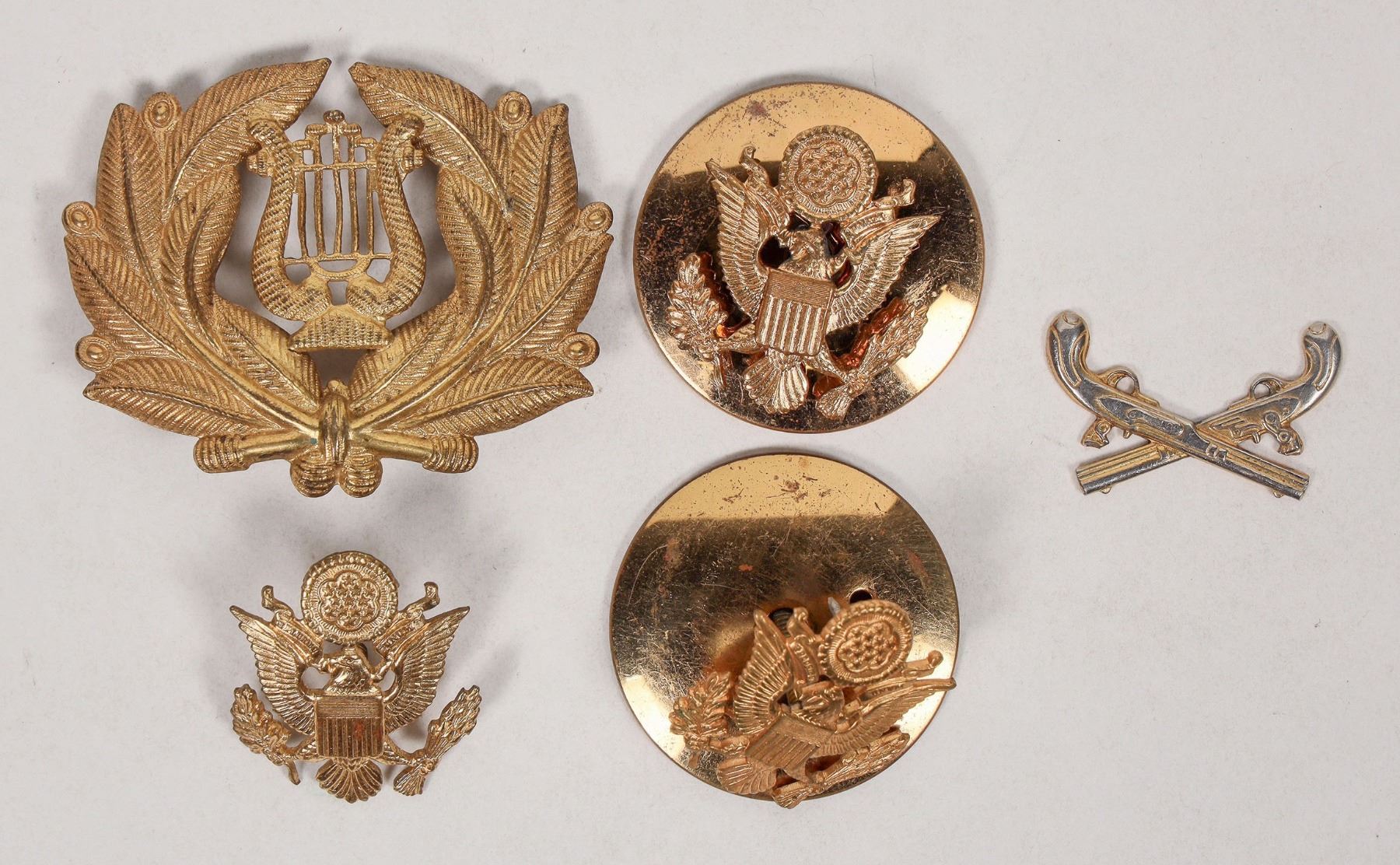 This set of US Army badges contains two hat badges, one badge without backing, a Musicians badge and a pistol marksman badge without pin. Please see photo for details.
