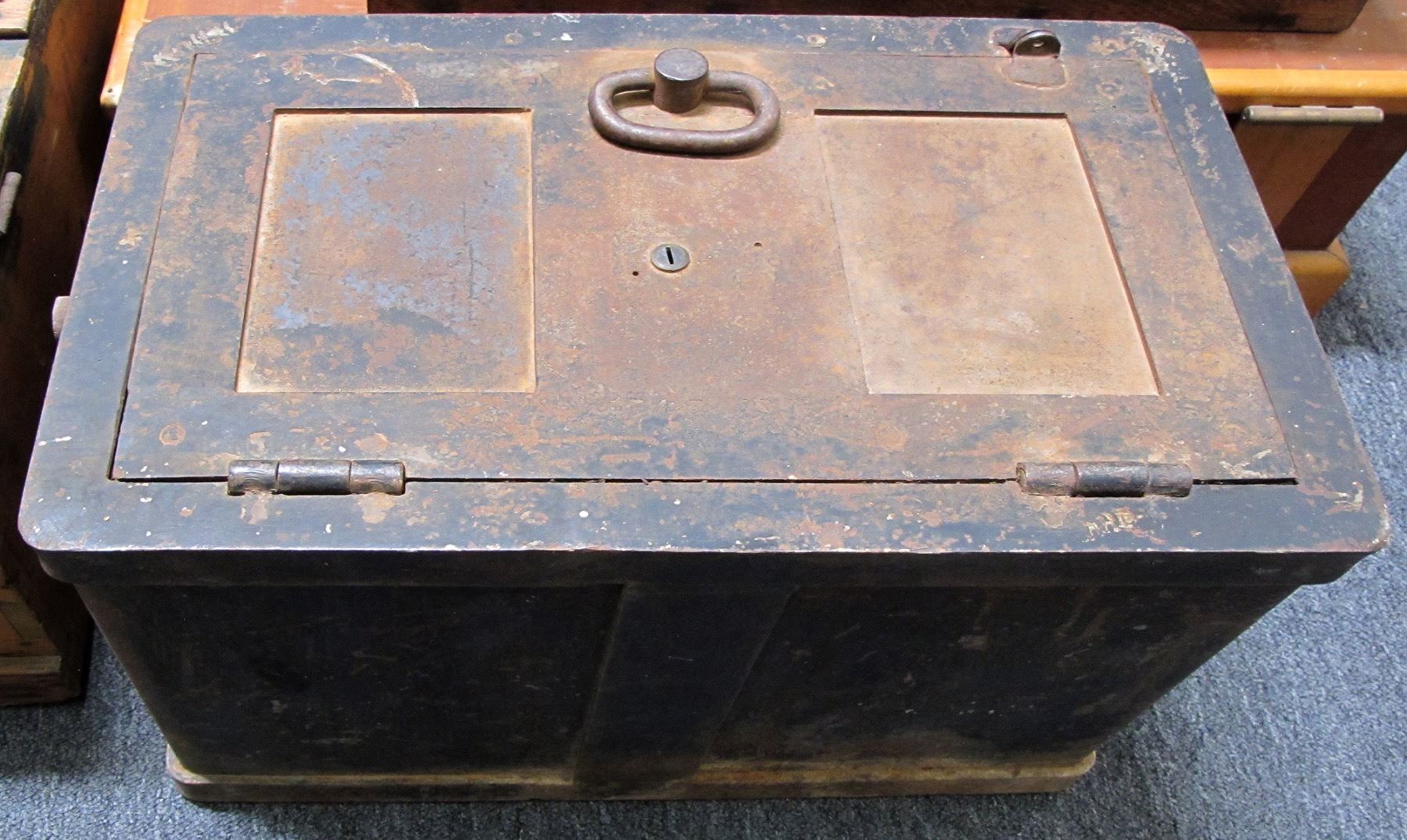 From Fort Kerney, Buffalo, Wyoming. 26 ½” long 15 ½” wide 15.5” tall. Strong box has the classic triangular handles, constructed of steel, very heavy, approximately one hundred pounds, no key. This strong box classically carried gold and is set up to carry very heavy weight. Additional shipping costs will apply. Pick-up highly recommended. Date: Location: HWAC# 75232