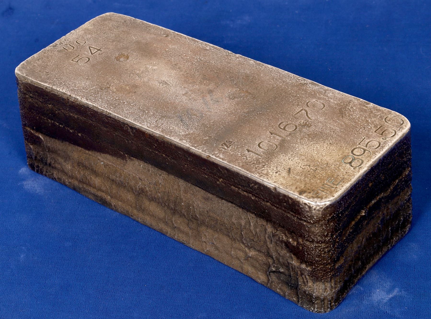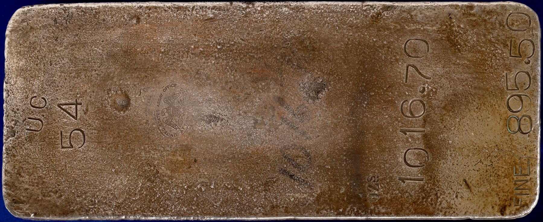 This is an original US Assay Office silver ingot, weighing about 60 pounds. It is a true rarity, as most of the US Mint or Assay office bars are significantly smaller. It is 11-3/4 x 4-3/4 x 3-7/8 inches. Like many other larger bars, this ingot is the product of five smaller pours. The weight is 1016.70 troy ozs, 895.50 fine, as stamped into the face. It is further punched "U. C. 54" which may be the client initials and serial number. It is in excellent condition.