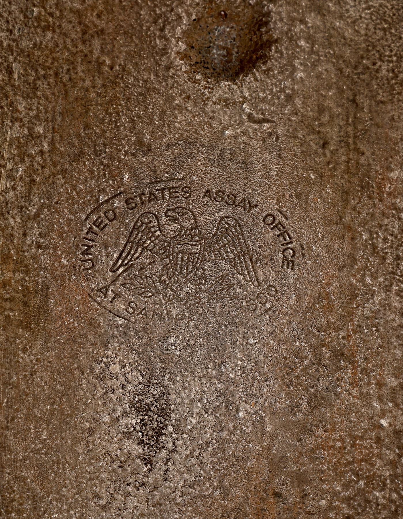 The ingot comes from the Central Valley area, held by the same family since its initial pour. It came to us in an old Farmers Merchants Bank, Lodi cloth bank bag. The USAO SF pattern is the small oval with eagle. See photos for details.