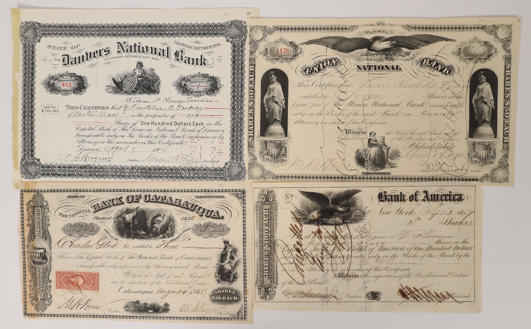 4 US bank stocks, all issued. 1878 Union National Bank. 1934 Danvers National Bank. 1868 Bank of Catasauqua. 1857 Bank of America.