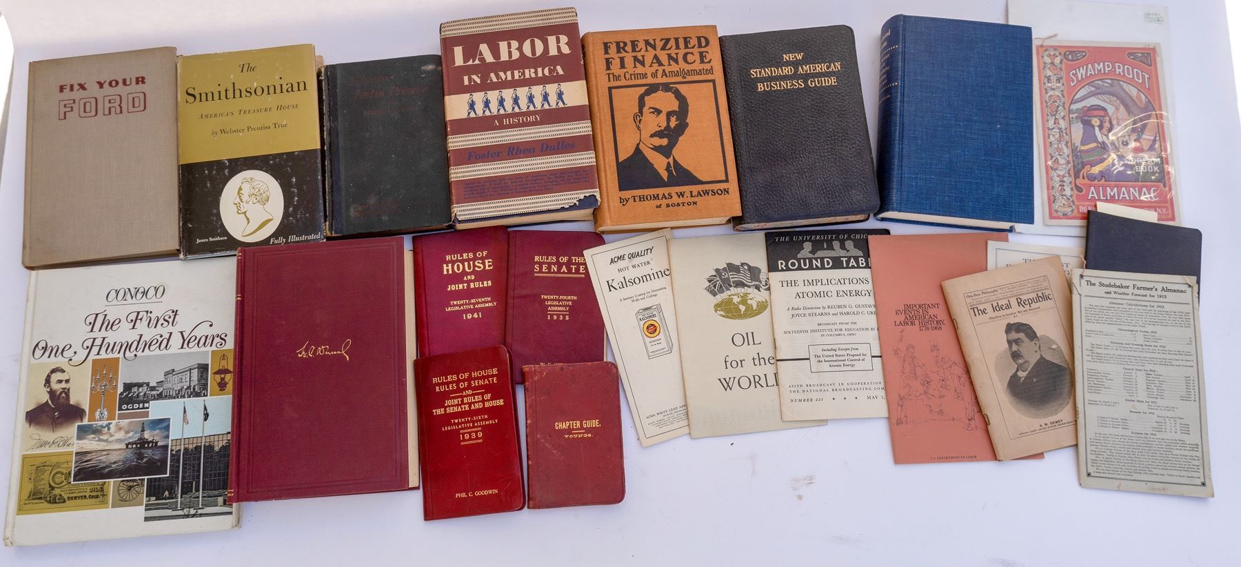 About 15 US business related publications. The Ideal Republic by Dewey, Law Observance by Durant, History of an Engineering Business 1832-1958 by Lincoln, Swamp-Root Almanac 1937, Conoco The First 100 Years, New Standard American Business Guide, Frenzied Finance by Lawson, Inductive Latin Primer by Harper, Labor in America by Dulles, The Smithsonian by True. Rules of the Senate 1935, 1939, 1941. State: City: Date: Provenance: Stuart Mackenzie Montana Ephemera Collection