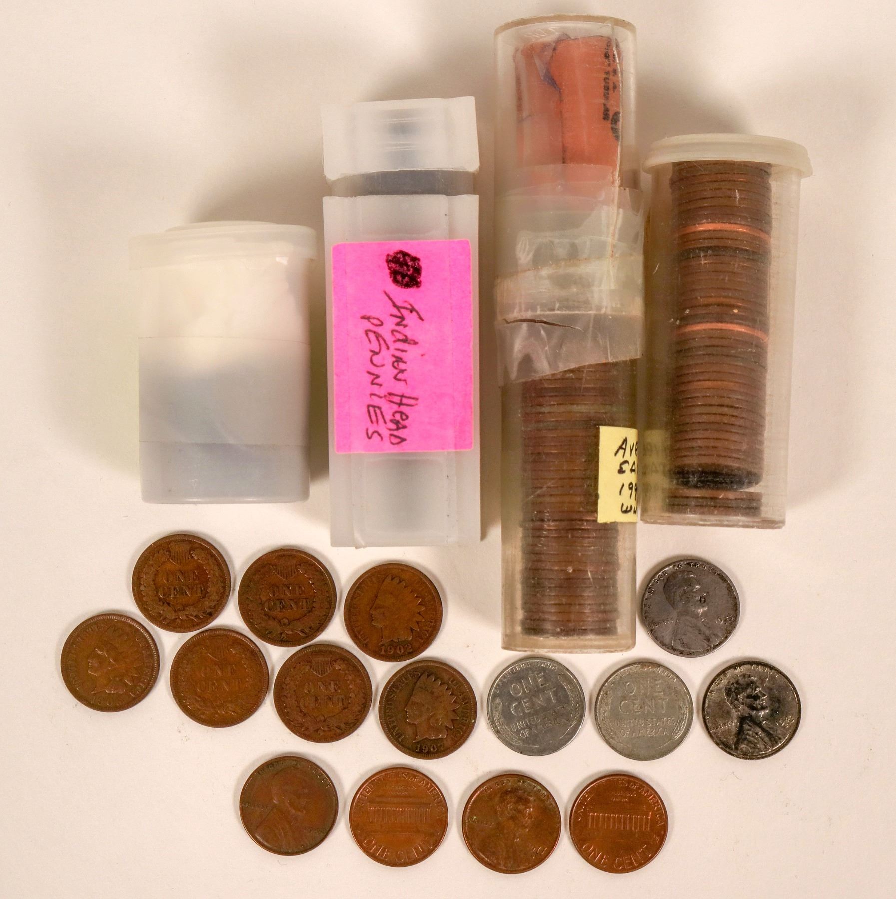 Indians 1900-1908 plus 1893, 1899 generally good to fine (47); 19 steel (mostly AU); 2.5 rolls Lincoln, about half wheat back.