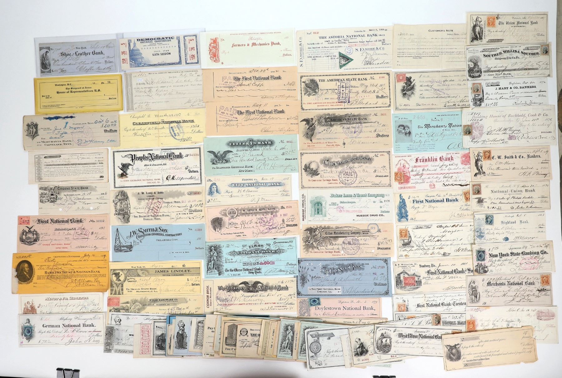 Lot of 140+ checks, issued from the 1840s-1920s (mostly). Many are pictorial. Some have adhesive revenue stamps. No RNs. Not many dupes. Largely Midwest & Eastern states (New York, Pennsylvania, Illinois, Tennessee, etc.). No Western checks. Worthy of inspection--not cherry picked!