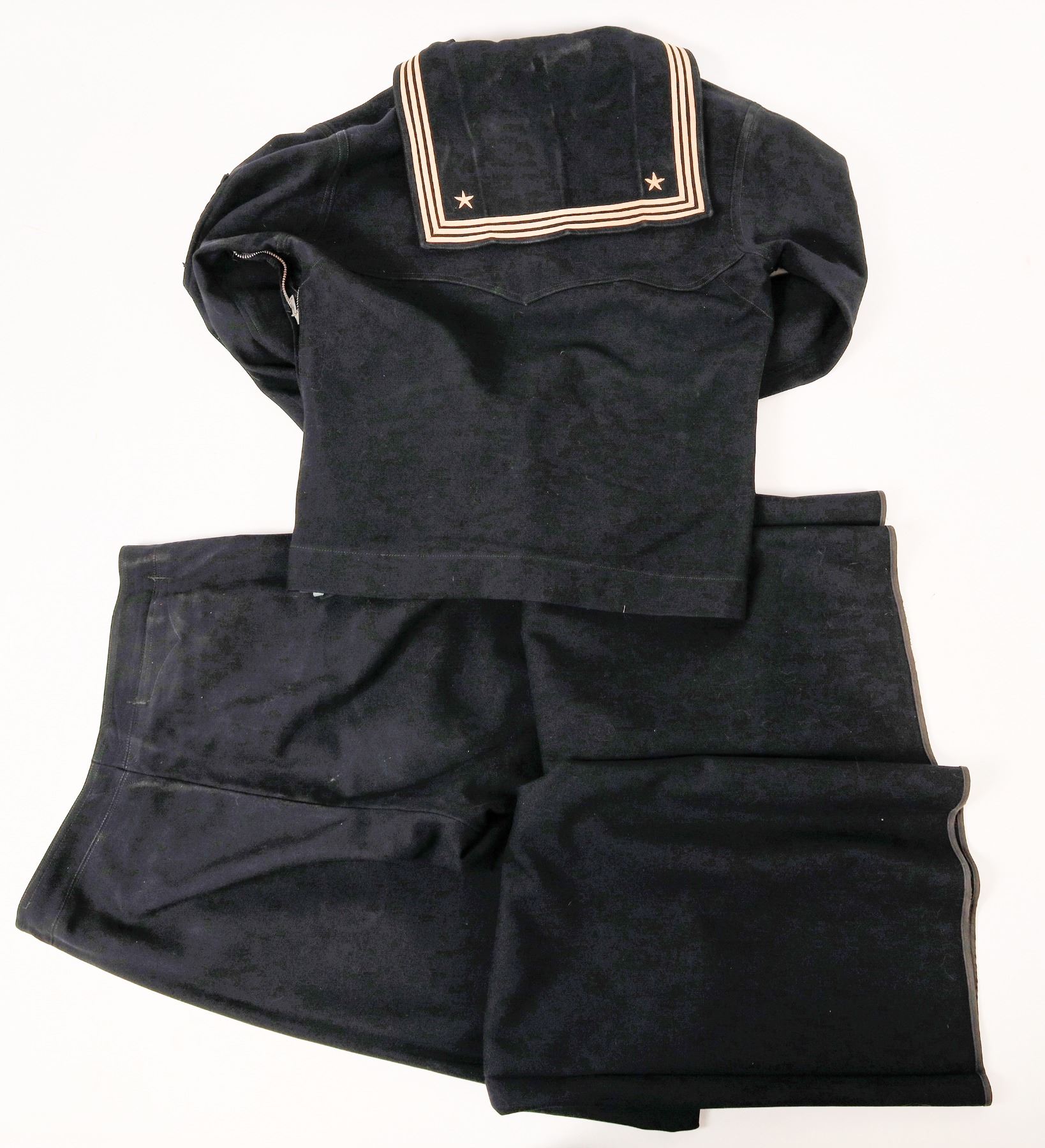 US Coast Guard Uniform woolen shirt and pants bearing a left shoulder patch for a Radioman 3rd Class and a Coast Guard shield on the lower right sleeve. Pants are 34-inch inseam, 45-inch total length, 28-inch waist. Shirt sleeves are 23 inches from the shoulder seam and 22 inches from the neck seam to the bottom. Original wearer worked in the North Atlantic on a minesweeper after WWII. One button missing on the upper right (as worn) of the pants, but otherwise the set is clean and in good condition. post WWII