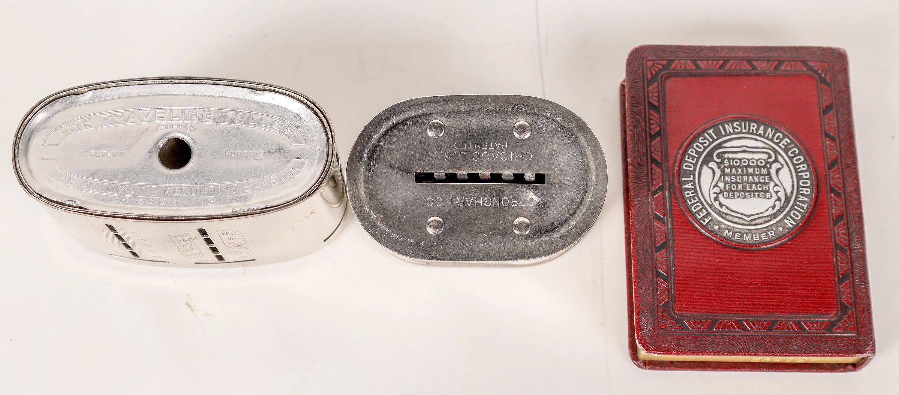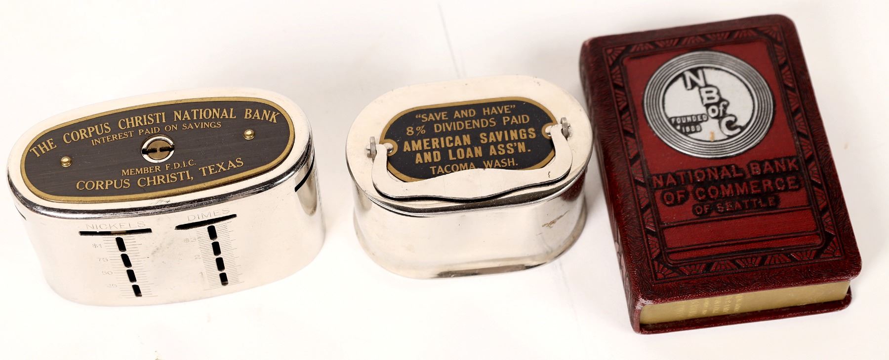 3 US coin banks. Inboxes-Corpus Christi National Bank, American Savings and Loan, Tacoma, Wash. Book style-National Bank of Commerce of Seattle.