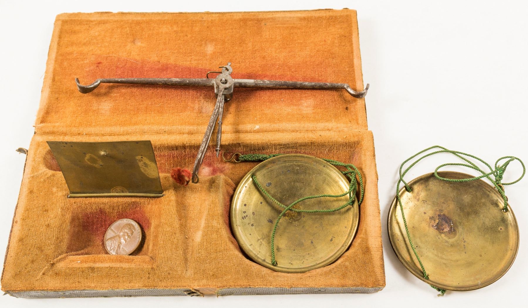 Early dark brown covered wood box (lined in velvet), embossed with a US American Eagle on the top in guilt. Brass scale with opening especially for small weights, which are not present. No manufactures name. Box measures 3.25 x 6.5". Front closure broken. Circa 1850.