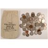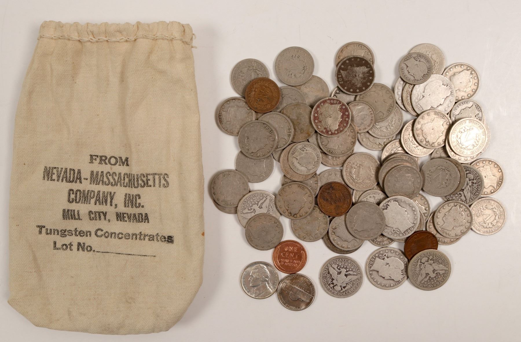 an intersting coin group from the John Heizer estate, Nevada Mining Engineer. Probably collected by John heizer. Consists of 54 V nickles well circulated; 12 Barber quarters; 5 Barber dimes; 2 Indians, others. Also includes several pieces Heizer picked out of circulation as uncirc at the beginning of the new coinage: 1938s Jefferson, 1943 S jeff, All this in one of Heizer's Nevada Massachusetts Mill City cloth bags.