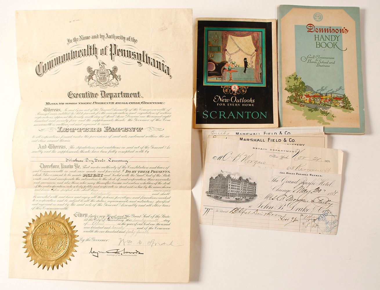 Lot of 8. 1) c.1924 highly illustrated catalog for Scranton Lace Company. 69 pages. 7" x 5" Some foxing. 2) Dennison's Handy Book. Small Conveniences for Home, School and Business. c.1920. Pictures and illustrations and prices. 80 pages. 8.5 x 5.5" Soiling. 3) 1920 Pennsylvania Letters Patent for Heckner Dry Goods Company. 4) Three receipts from Marshall Field & Co, 1896, Chicago. 5) 1870 billhead for Alex T Stewart & Co., Retail Department, New York. 6) Pictorial billhead for Grand Pacific Hotel in Chicago, John B. Drake & Co., 1884. (Prag Collection) Date: 1870-1924 Location: HWAC# 55411