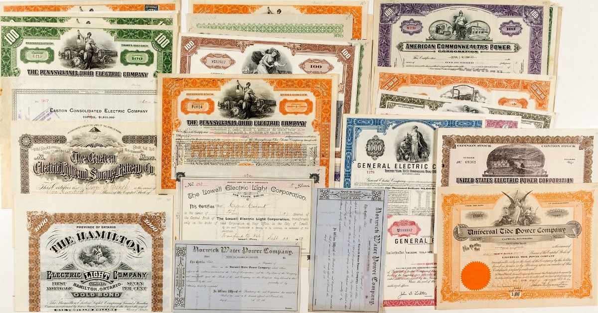 Lot of 38, most pictorial. Mostly stocks. Pre-1900 pieces include: Easton Cons. Electric Co. (1899), The Lowell Electric Light Corp. (1889), The Hamilton Electric Light Co. (1890 bond), and The Eastern Electric Light & Storage Battery Co. (1895). Also includes: General Electric, Universal Tide Power Co., US Electric Power Corp., Southwest Power Co., Boston Electric Associates, Cons. Edison Co. of New York, Fort Bragg Electric Co., Union Power Corp., American Commonwealths Power, Inland Power & Light Corp., Pennsylvania-Ohio Electric Co., Nevada Power Co., and more. Please inspect. (Prag Collection) City: State: United States Date: 1889-1973 hwac# 34724