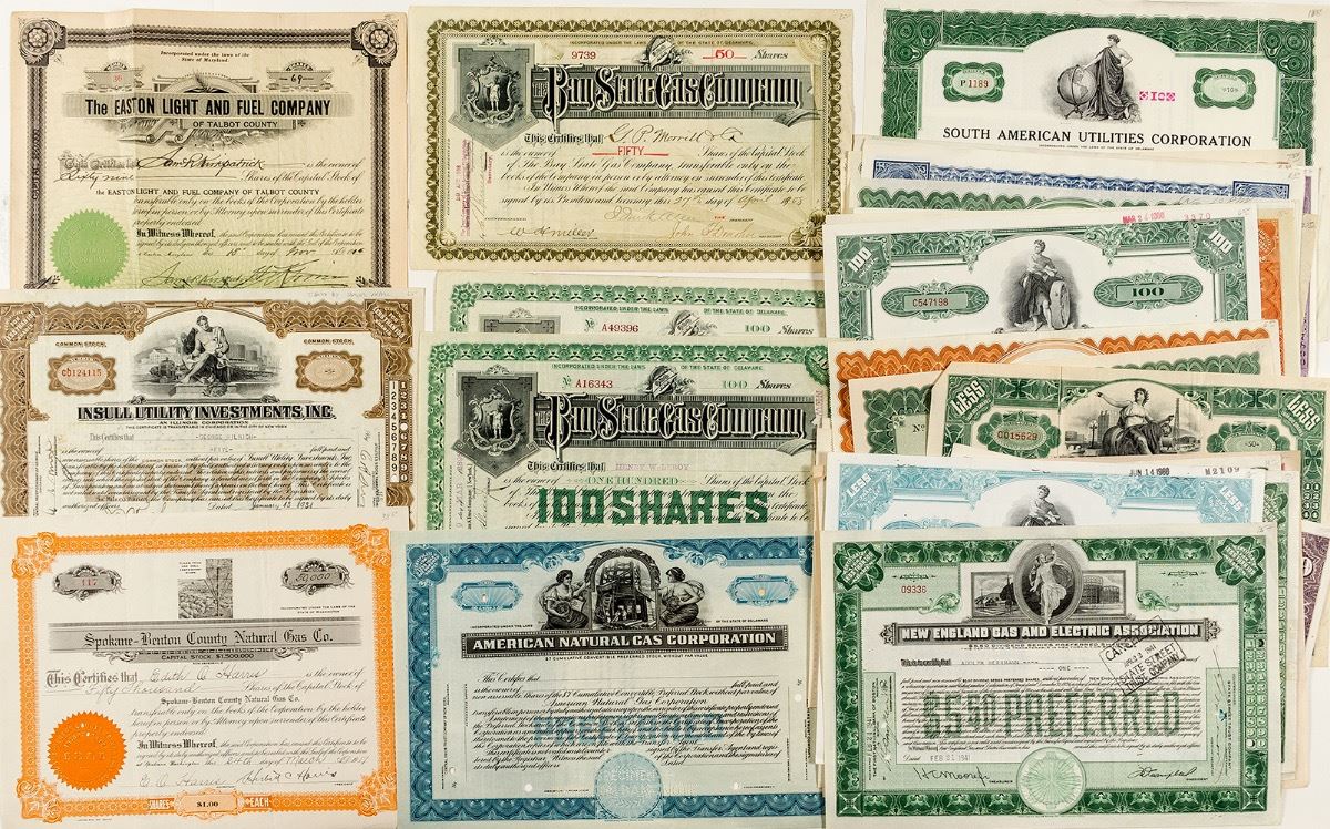 Lot of 42. Most pictorial. Earliest is 1880 Arlington Gas Company bond. Also includes: Pacific Gas & Electric, Spokane-Bento County Natural Gas Co., General Public Utilities Corp., Bay State Gas Co., Public Gas Corp., American Natural Gas Corp., New York State Electric & Gas, Appalachian Gas Corp., Assoc. Gas & Electric, New England Gas & Electric, Newburyport Gas & Electric Co., and much more. Please inspect! (Prag Collection) City: State: Date: 1880-1966 ID# 34725