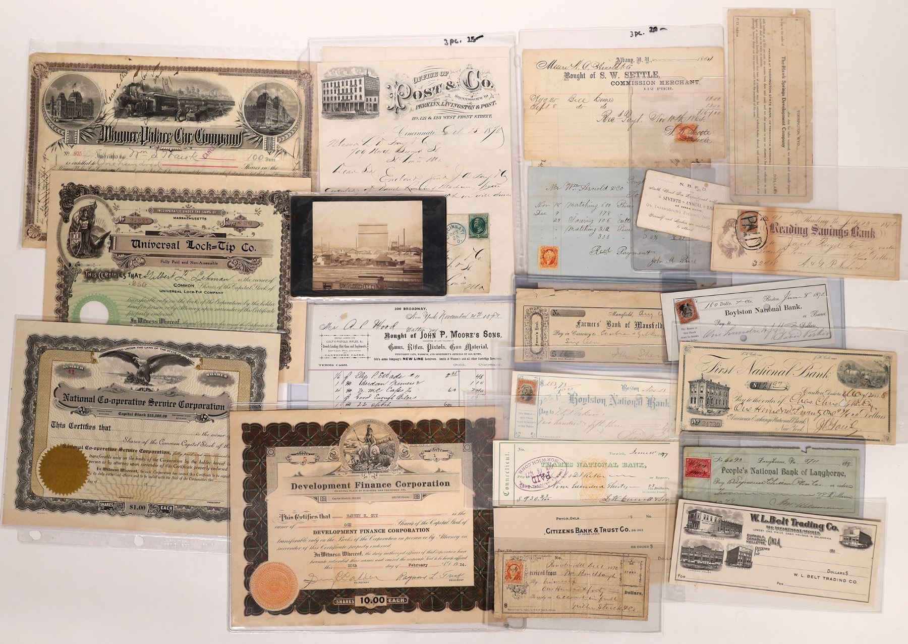 Photo-Omaha railroad yard, 3.75x4.5". 1890 North Bend Fire Dept. ball ticket, 2.5x4", front spot, verso hinge residue. 11 c. 1863-1910's checks. Wagner Palace Car 1890 stock and 2 other stocks,Billheads etc, see photo.