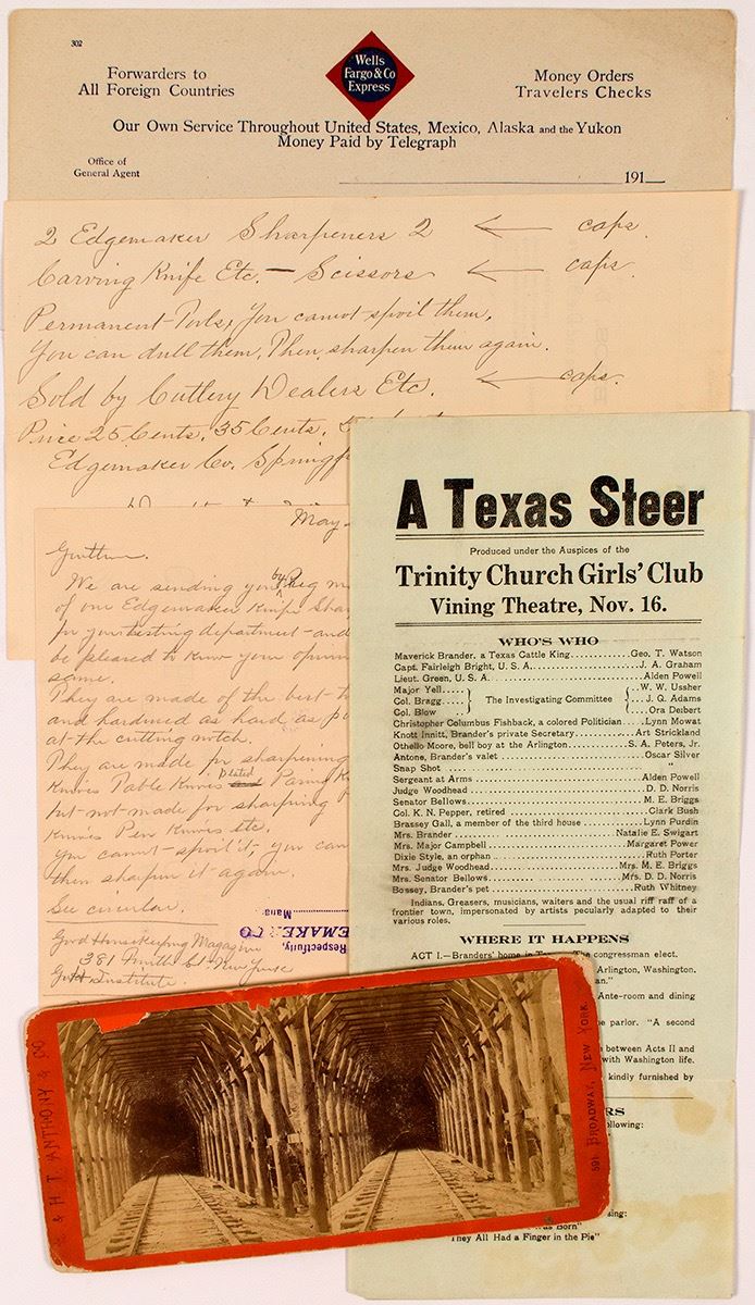 Two blank front statements with handwritten notes on back pertaining to sharpeners. Young Brothers Engravers, Springfield Mass. c. 1913. Wells Fargo & Co. Express, blank memo page. Program for a play called "A Texas Steer". Three folds and some staining on bottom. Stereo scope of Broadway, New York tunnel. Blank folded heavy paper card, Executive Mansion, Washington. Date: Location: HWAC# 50848