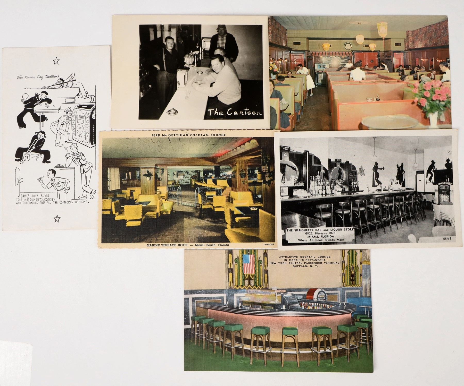 Lot of (7). Five photo post cards, a caricature Bar card, and (1) 5x7 B&W photo. The various Bar photo cards are from the Silhouette Bar in Miami, a Train station Bar in Buffalo, a Chinese Bar & Restaurant in Rutland Vermont, plus others. Please inspect.