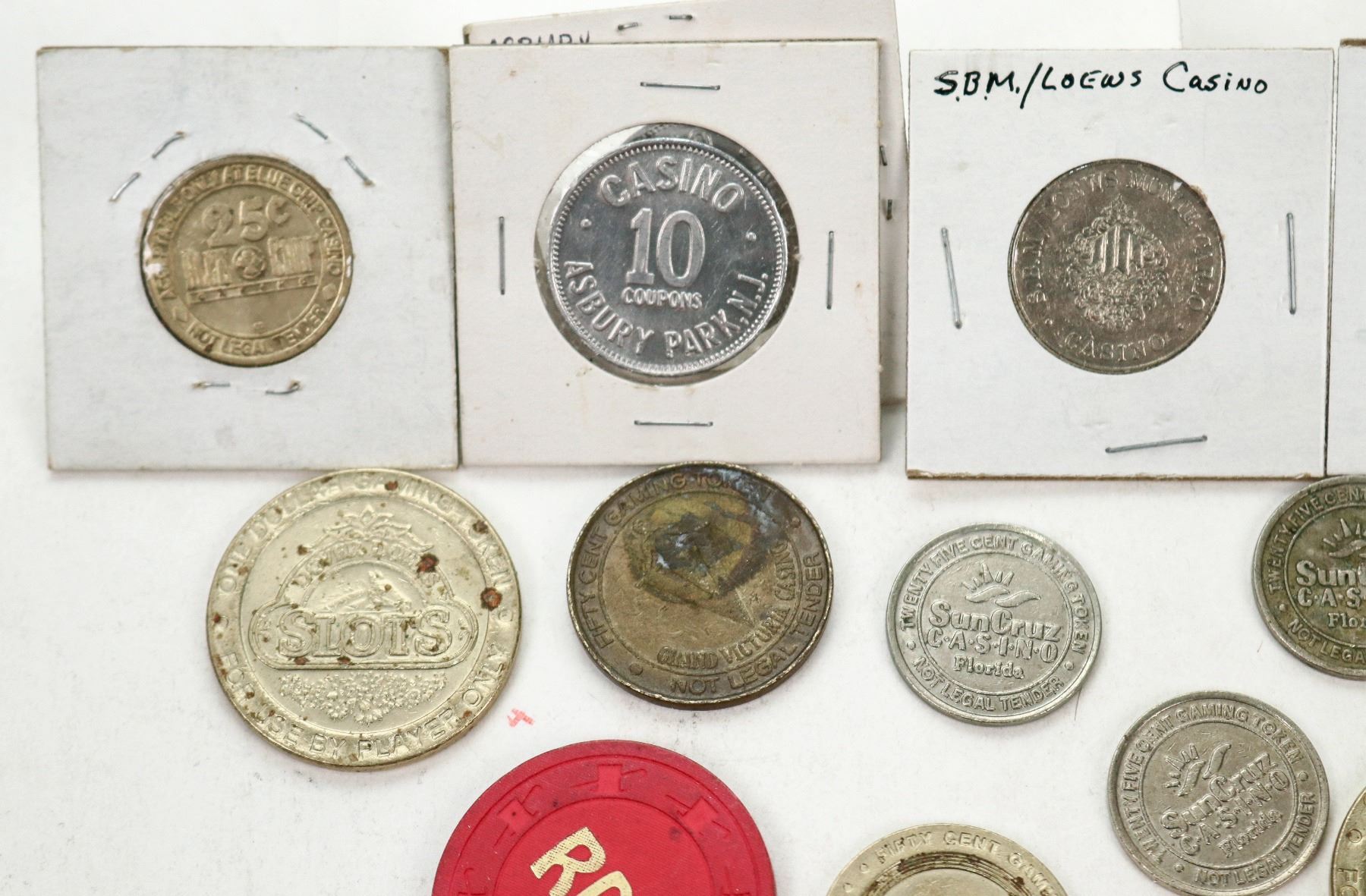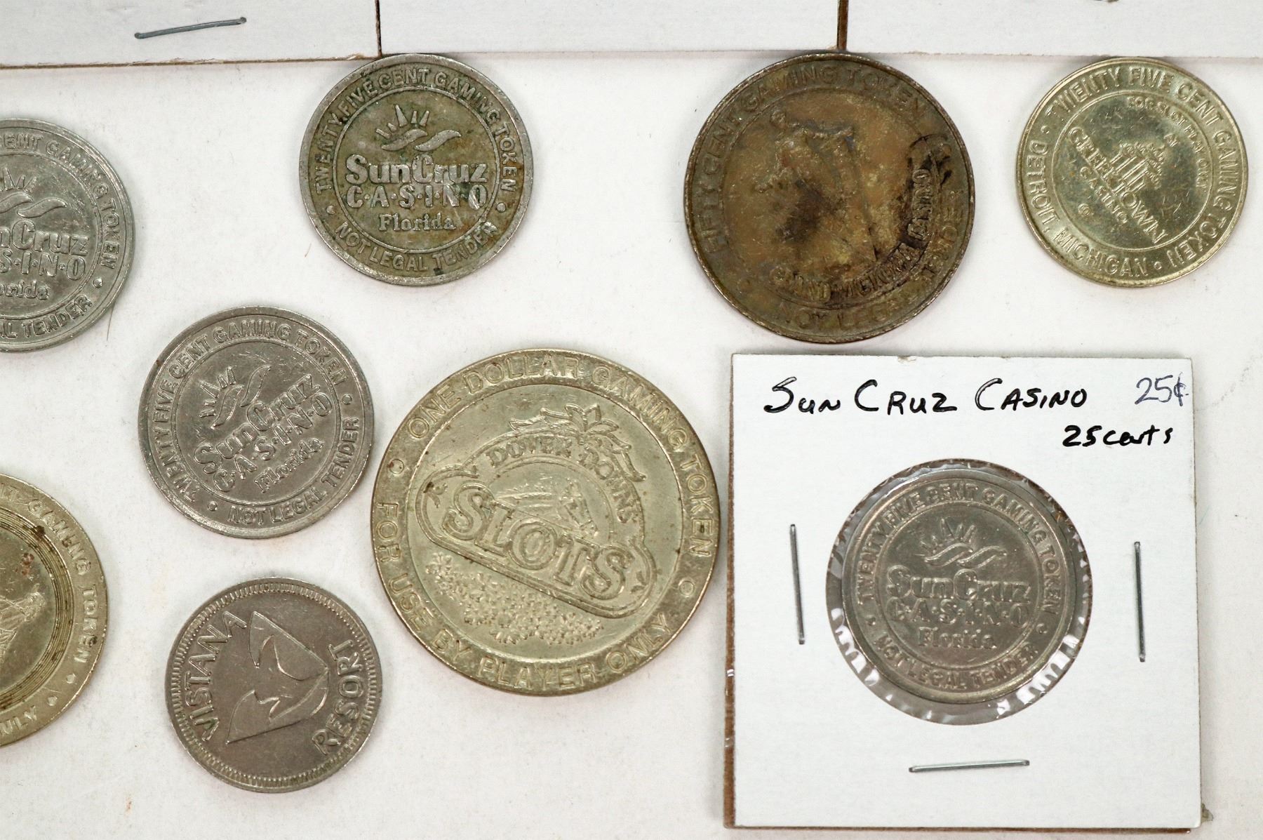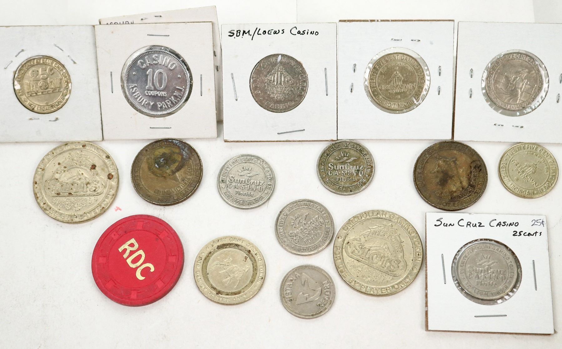 18 assorted US gaming tokens and chips. Sun Cruz Casino, Asbury Park, NJ, Savannah Lady, Vistana Resort, Blue Chip Casino, IN etc. See photo.