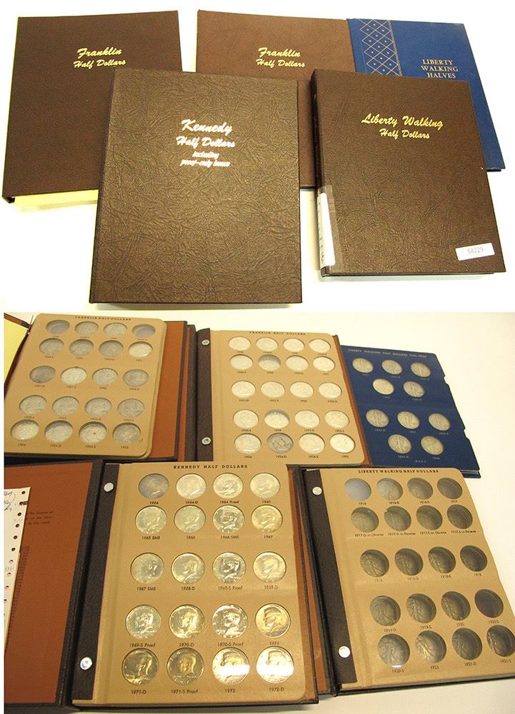 Two albums with walking liberty halves, 40 pieces, no rare dates, generally fine to AU. Two albums of Franklin half dollars, 67 pieces, many in uncirculated, not a complete set among the group however, but a nice group. 100 Kennedy haves, all different, nearly complete set missing a few proofs, generally uncirculated to proof examples. This is a very nice group of Kennedy halves, premium condition. ($800+ in silver) Date: Location: HWAC# 58229