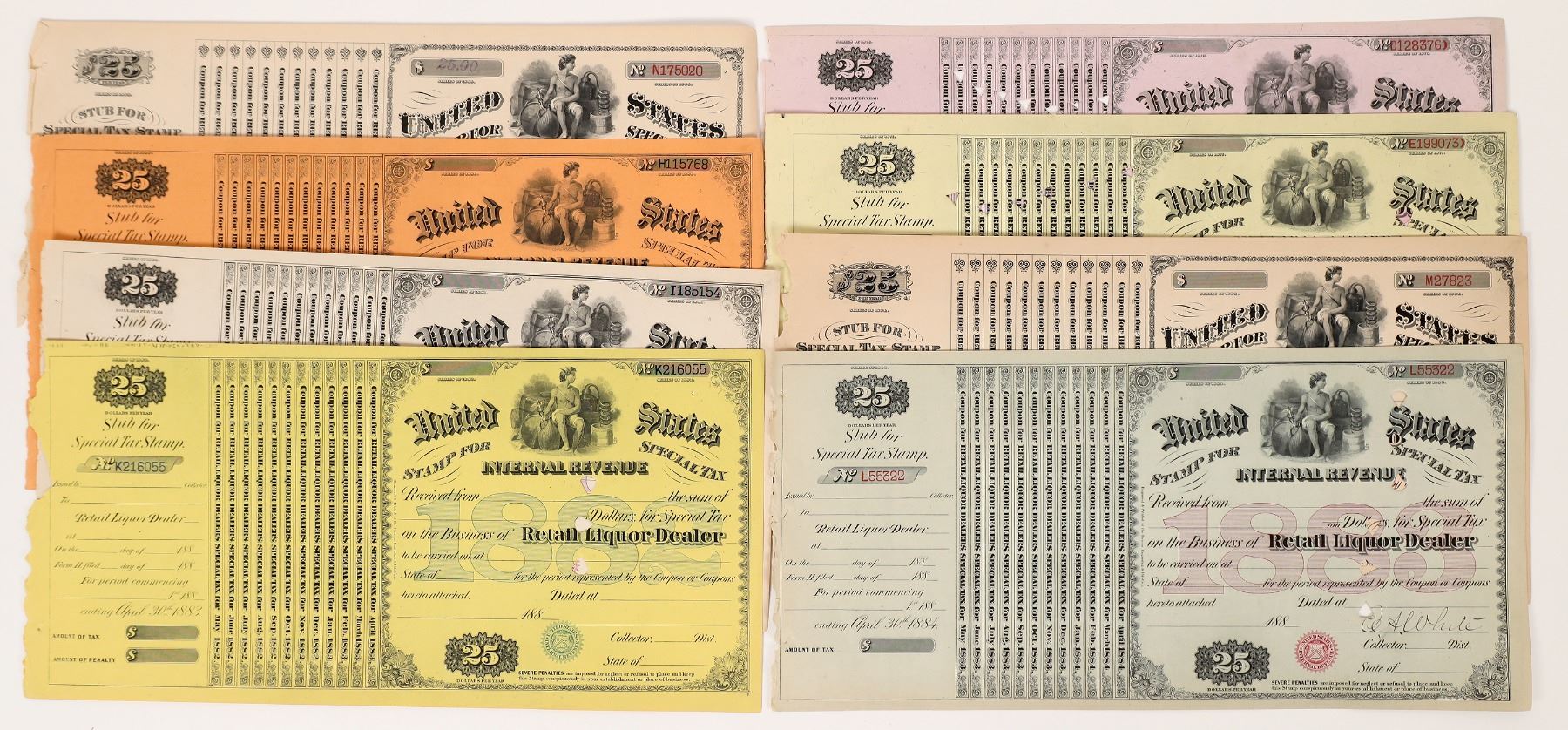 8 unissued US Internal Revenue Retail Liquor Dealer licenses, c. 1876-85 with 1878 and 1879 missing. Tax was $25/year.