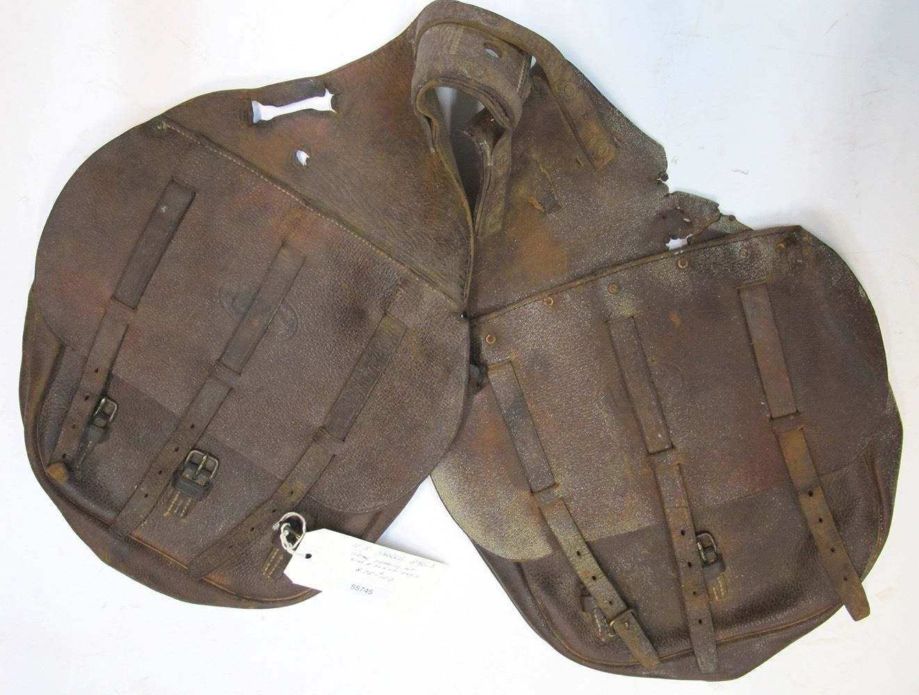 Dual leather saddle bag with stamped US. 3 buckles on one side, two on the other. One buckle is broken. Several tears on top of bag. Sold as is. Date: Location: HWAC # 55745