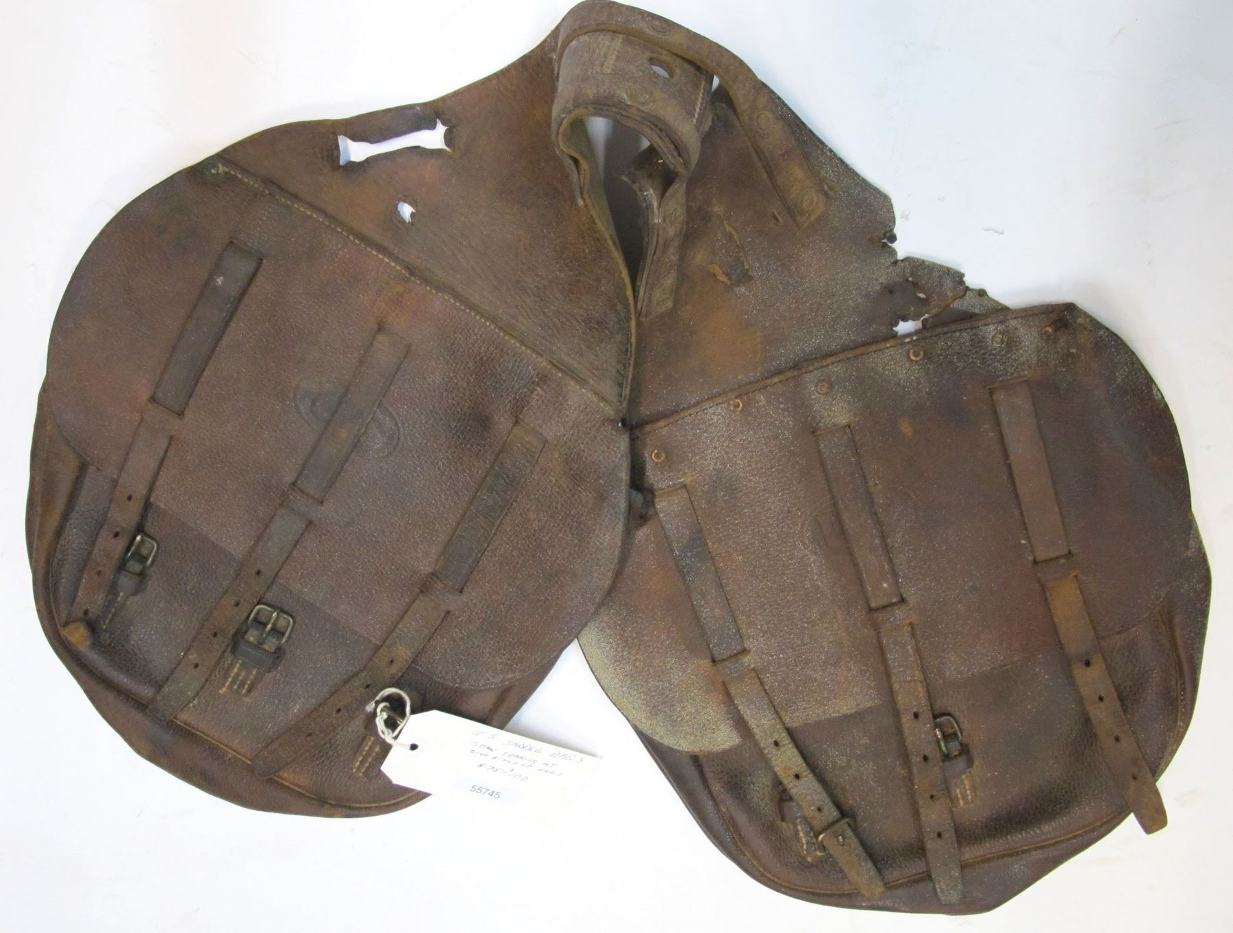 Dual leather saddle bags with stamped US. 3 buckles on one side, two on the other. One buckle is broken. Several tears on top of bag. Sold as is. Date: City: State: HWAC# 55745